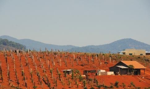 | Một dải núi ở cao nguyên M'Nông được dân di cư mới dọn sạch và cắm trụ tiêu xuống, và bắt đầuhình thành thêm làng xóm |