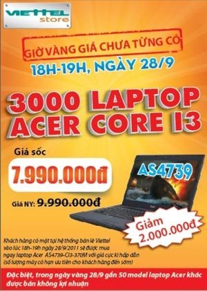 Theo đó trong giờ vàng, laptop Acer AS4739 cấu hình Core i3/ Ram 2 GB/ ổ cứng