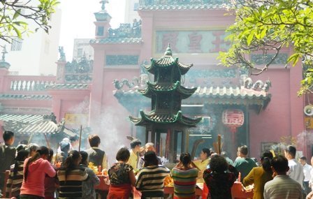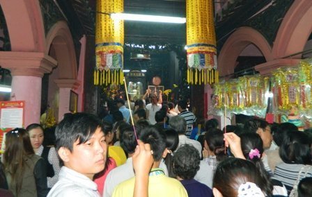 Tại chùa Phước Hải (còn gọi là chùa Ngọc Hoàng, Q.1 – TP.HCM), lượng người đổ về đây mỗi lúc một đông. Nhiều người đã dành khoảng thời gian nghỉ trưa ngắn ngủi để đến đền thắp nhang, cầu may mắn trong năm mới Quý Tỵ.
