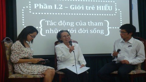 Trong phần trò chuyện với các bạn trẻ, chị Nguyễn Vân Nguyệt - GĐ Trung tâm Sống và Học tập vì Môi trường và Cộng đồng - Live & Learn cho rằng, tham nhũng ảnh hưởng tới tất cả mọi người, trên mọi lĩnh vực. Nó không chỉ khiến cho những nguồn lực phục vụ con người bị cắt giảm, mà còn ảnh hưởng trực tiếp tới bầu không khí, tới tiếng nói của mỗi người: "Tham nhũng đang làm cho nhiều bạn trẻ bị mất niềm tin vào cuộc sống, ảnh hưởng chính tới sự phát triển, tới tiềm năng của các bạn. Thậm chí nhiều bạn trẻ thậm chí sẵn sàng "đen" theo nó".
