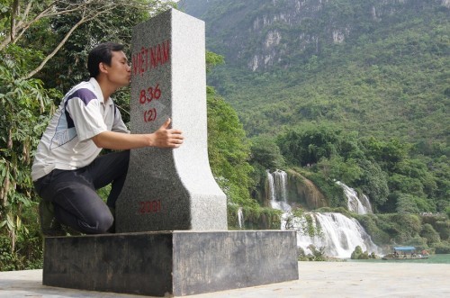 Tôi cứ ám ảnh mãi về cái đêm hát quốc ca Việt Nam nơi cột mốc 836(2) ở chân thác Bản Giốc. Tôi cứ thích chụp mãi bức hình từng người trong đoàn lên ôm hôn cột mộc nơi biên cương.