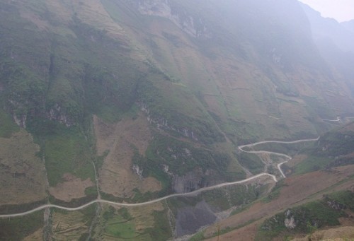 đường xuống thung lũng sông Nho Quế như sợi chỉ vắt ngang trời, đường lên cổng