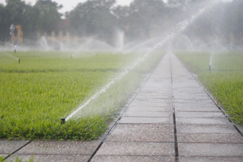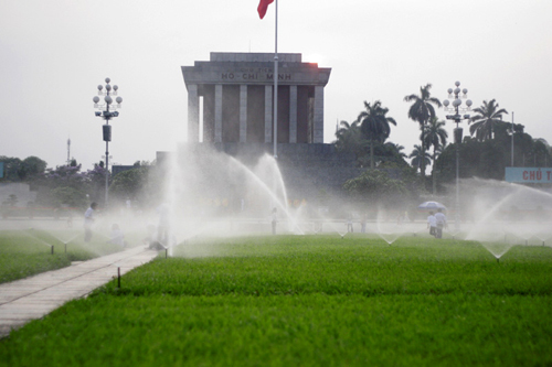 | Những dòng nước mát lạnh được phun để tưới cỏ xung quanh quảng trường trước lăng. |