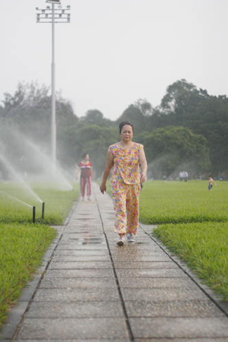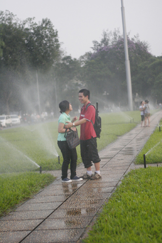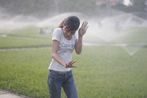 Dưới cái nắng oi ả của Hà Nội, ai cũng muốn tìm đến một không gian mát mẻ. Vì vậy nhiều người tranh thủ mỗi buổi chiều thềm cỏ lăng Bác được tưới nước, tận hưởng những luồng nước mát lạnh, để quên đi nắng nóng và những giọt mồ hôi.