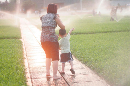 | Cậu bé vui mừng khi được mẹ dẫn ra sân phun nước |