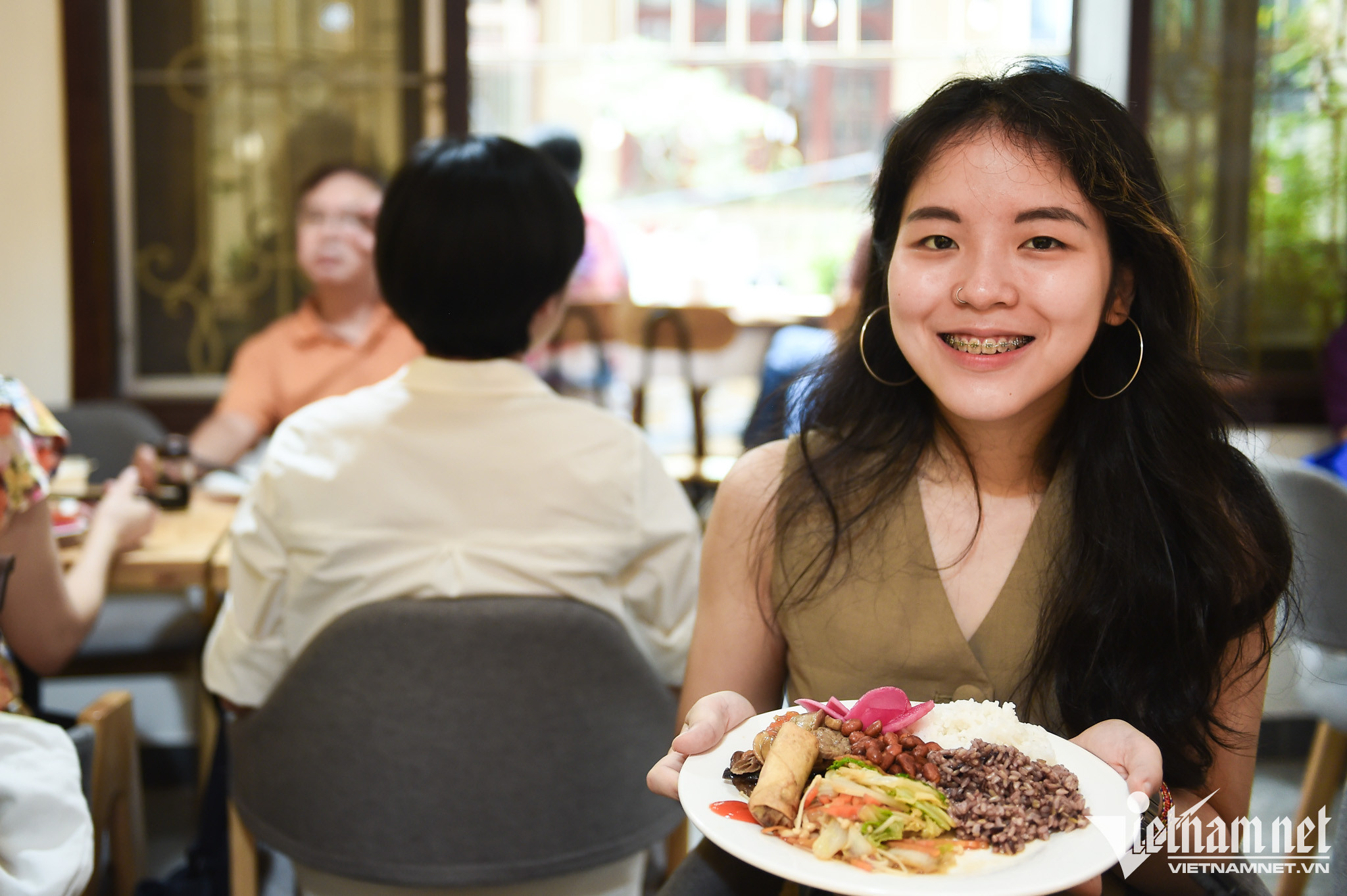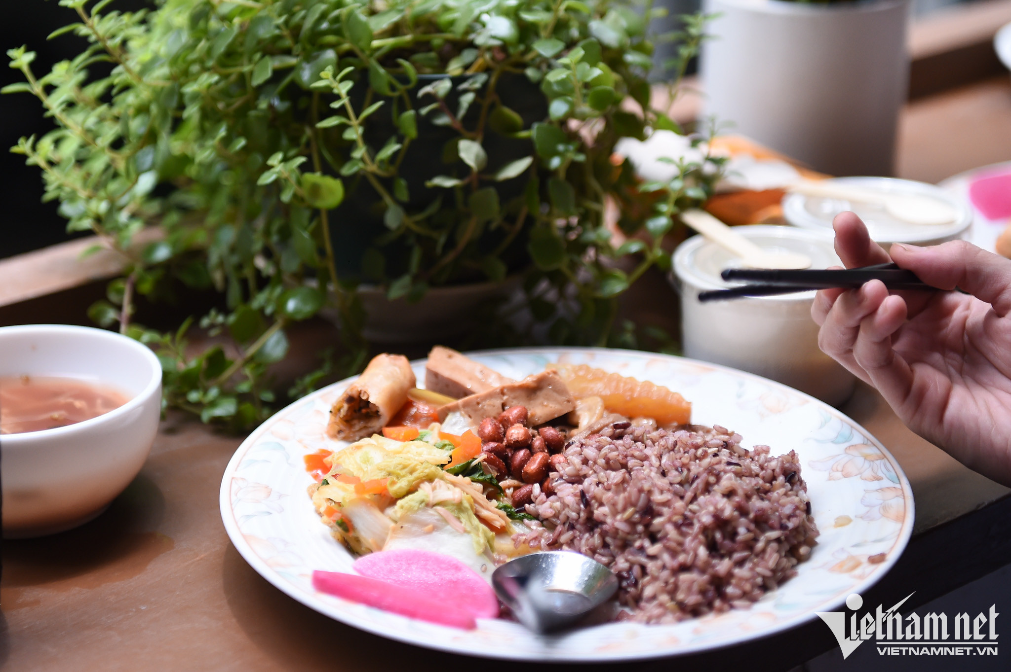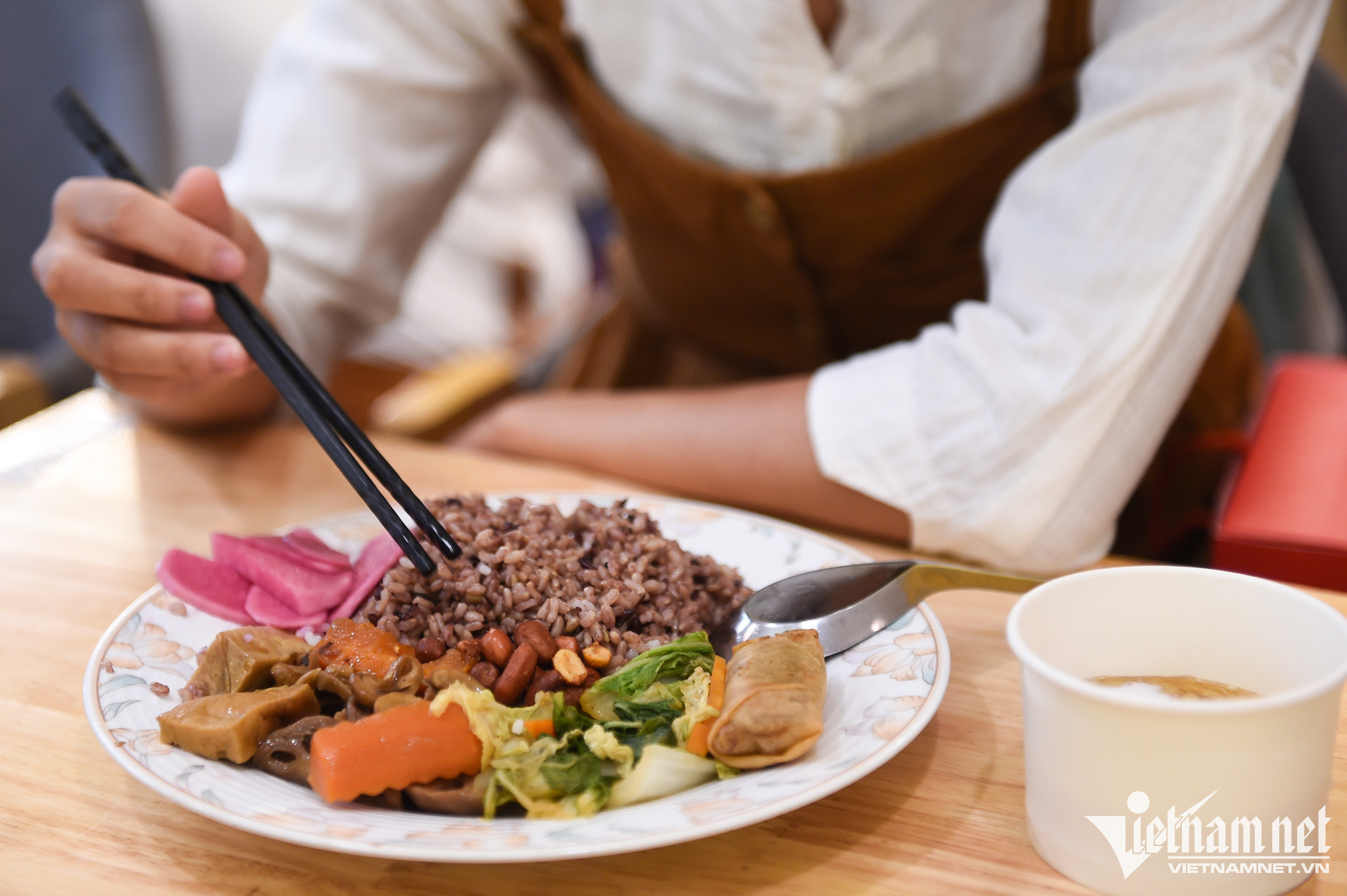 Những năm gần đây, việc ăn chay trở nên khá phổ biến, đặc biệt là với giới trẻ. Nhiều người bắt đầu tìm hiểu về các cách ăn thực dưỡng hoặc tập thói quen ăn chay để cân bằng dinh dưỡng cho cơ thể. 11h30 tại một quán đồ chay ở quận Đống Đa, Hà Nội, các bàn ăn đã kín chỗ.Những suất cơm 30.000 đồng được chế biến chủ yếu từ rau củ, nấm... Các món ăn thường ít dầu mỡ, không sử dụng mì chính, hạt nêm, đường kính trắng thay vào đó là các gia vị thực dưỡng như tương tamari, cốt mắm chay, muối biển, đường phèn, nước rau củ tự ninh...Trần Hằng (bên phải, 28 tuổi) bắt đầu ăn chay từ 3-4 năm trước. "Mình không ăn chay trường, thường chỉ ăn vào mùng một và 15 Âm lịch. Hôm nay là rằm tháng 8 nên mình rủ bạn bè đi ăn cùng", Hằng chia sẻ. Cô cũng cho biết lý do chính để duy trì thói quen đồ chay là sau khi bản thân tìm hiểu về vấn đề bảo vệ môi trường và hệ sinh thái.Một vài thực khách tới quán chọn chỗ ngồi phía ngoài ban công để có cây xanh, tạo cảm giác gần gũi.Nhiều nhóm bạn trẻ thường là dân văn phòng hoặc làm việc quanh khu vực cũng tranh thủ tới ăn trưa ngày rằm tháng 8.Bích (24 tuổi) đi ăn một mình. Cô chia sẻ vì bản thân vốn tự lập nên không ngại đi ăn một mình. "Ăn chay cũng tùy quán vì mình không thích đồ nhiều dầu mỡ. Mình giữ thói quen đến đây vì món ăn chế biến thanh đạm, vừa miệng, không ngấy, không ngọt", Bích nói.