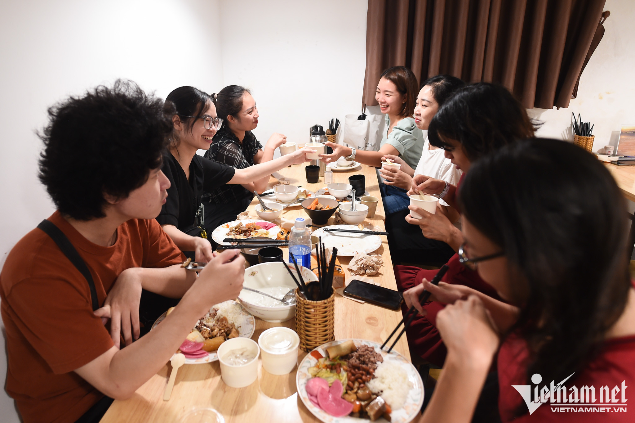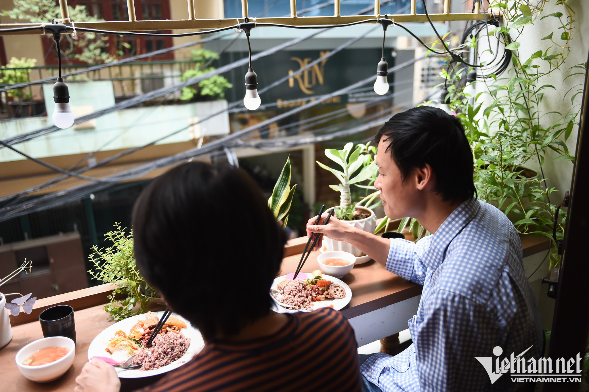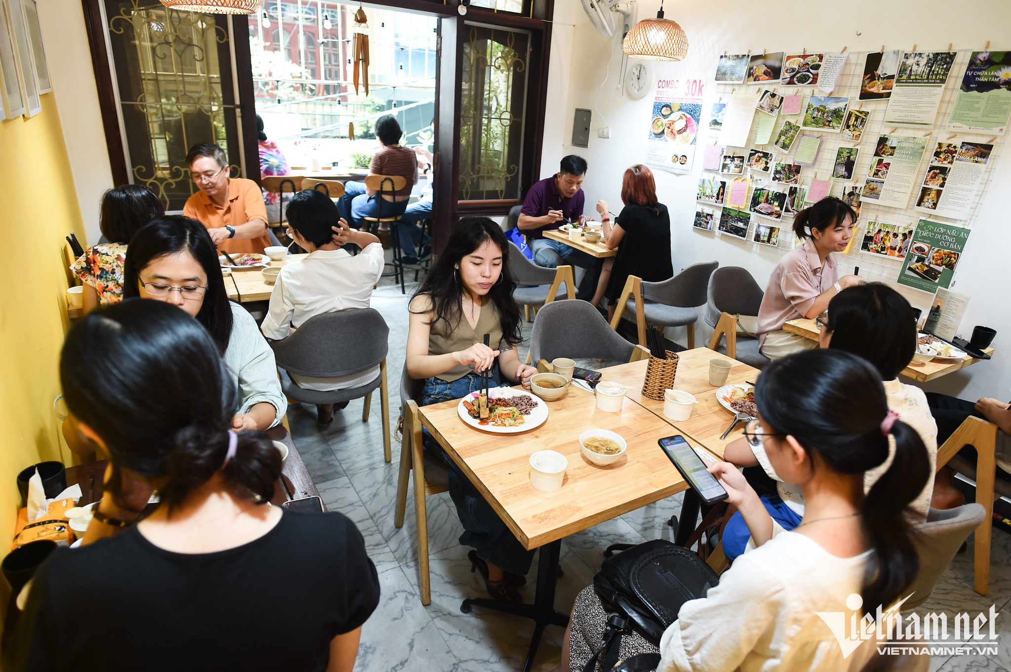 Những năm gần đây, việc ăn chay trở nên khá phổ biến, đặc biệt là với giới trẻ. Nhiều người bắt đầu tìm hiểu về các cách ăn thực dưỡng hoặc tập thói quen ăn chay để cân bằng dinh dưỡng cho cơ thể. 11h30 tại một quán đồ chay ở quận Đống Đa, Hà Nội, các bàn ăn đã kín chỗ.Những suất cơm 30.000 đồng được chế biến chủ yếu từ rau củ, nấm... Các món ăn thường ít dầu mỡ, không sử dụng mì chính, hạt nêm, đường kính trắng thay vào đó là các gia vị thực dưỡng như tương tamari, cốt mắm chay, muối biển, đường phèn, nước rau củ tự ninh...Trần Hằng (bên phải, 28 tuổi) bắt đầu ăn chay từ 3-4 năm trước. "Mình không ăn chay trường, thường chỉ ăn vào mùng một và 15 Âm lịch. Hôm nay là rằm tháng 8 nên mình rủ bạn bè đi ăn cùng", Hằng chia sẻ. Cô cũng cho biết lý do chính để duy trì thói quen đồ chay là sau khi bản thân tìm hiểu về vấn đề bảo vệ môi trường và hệ sinh thái.Một vài thực khách tới quán chọn chỗ ngồi phía ngoài ban công để có cây xanh, tạo cảm giác gần gũi.Nhiều nhóm bạn trẻ thường là dân văn phòng hoặc làm việc quanh khu vực cũng tranh thủ tới ăn trưa ngày rằm tháng 8.Bích (24 tuổi) đi ăn một mình. Cô chia sẻ vì bản thân vốn tự lập nên không ngại đi ăn một mình. "Ăn chay cũng tùy quán vì mình không thích đồ nhiều dầu mỡ. Mình giữ thói quen đến đây vì món ăn chế biến thanh đạm, vừa miệng, không ngấy, không ngọt", Bích nói.
