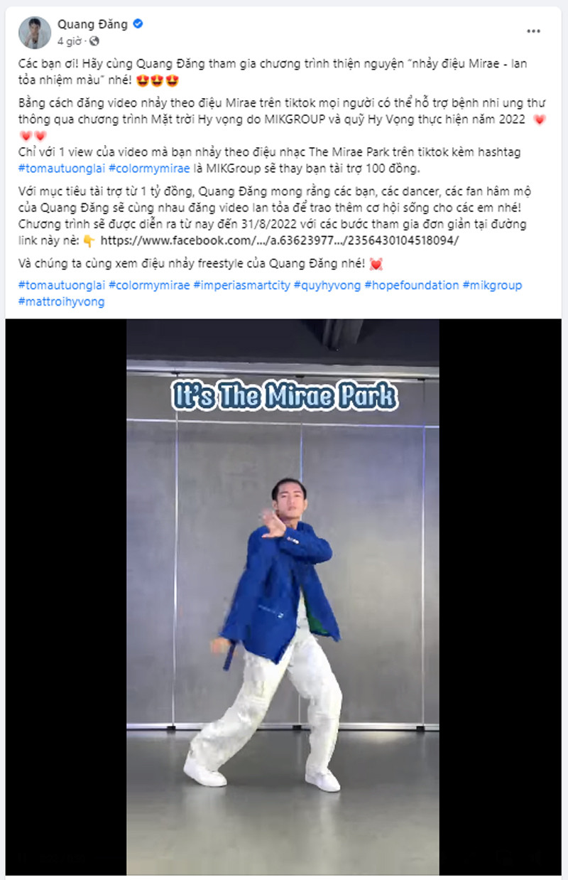 Đoạn video kéo dài chưa tới một phút, nhưng khiến người xem đã mắt với những bước nhảy điêu luyện. Quang Đăng cho biết: “Tôi mong mọi người, các dancer và fan sẽ cùng nhau đăng video lan tỏa để trao thêm cơ hội sống cho các em”.