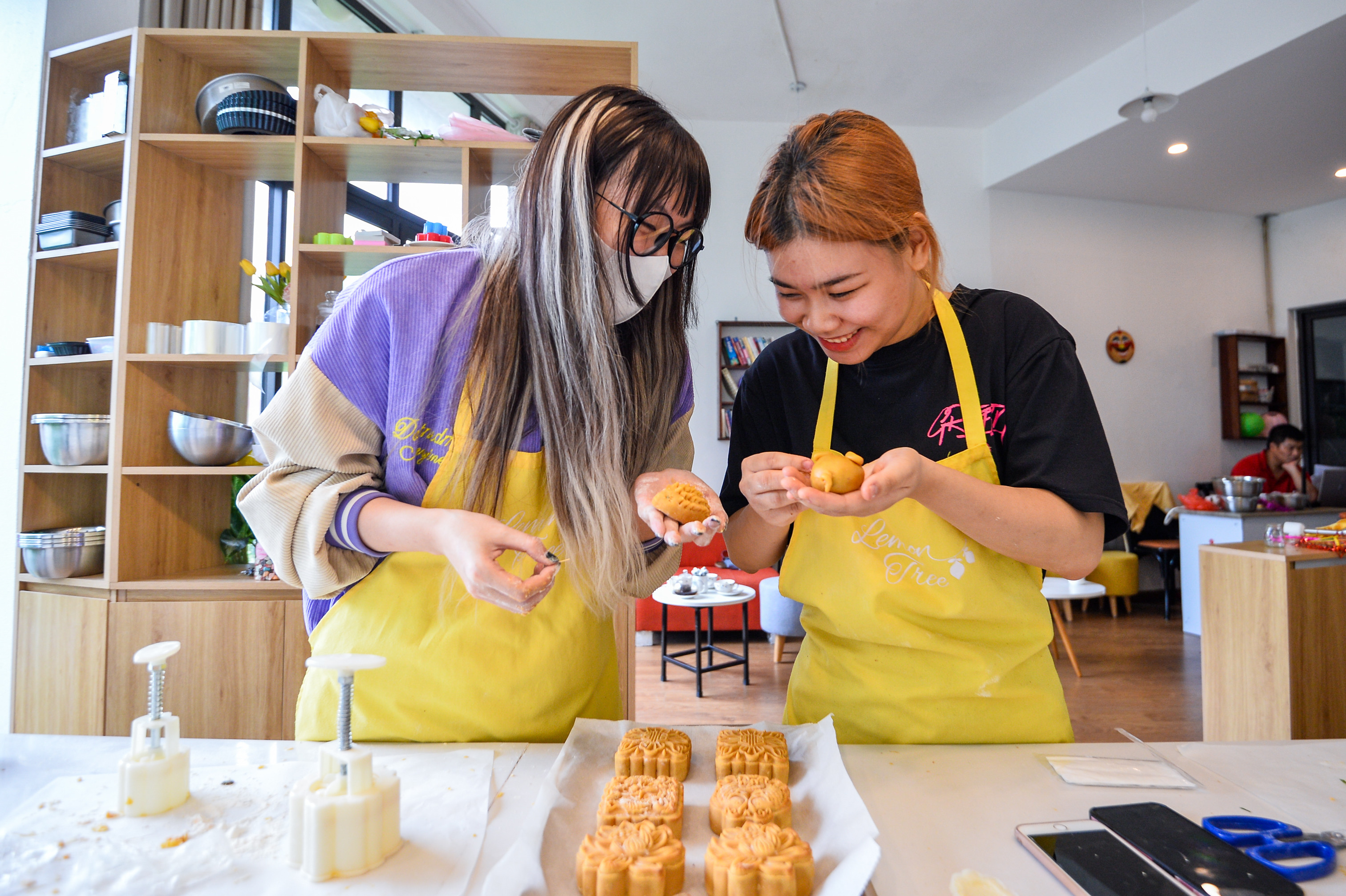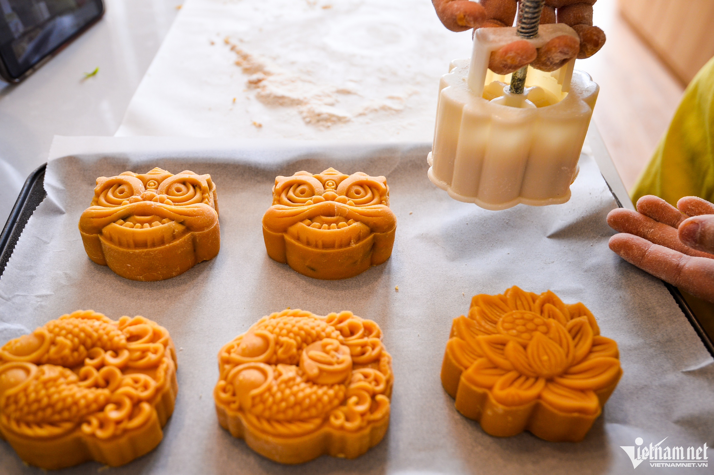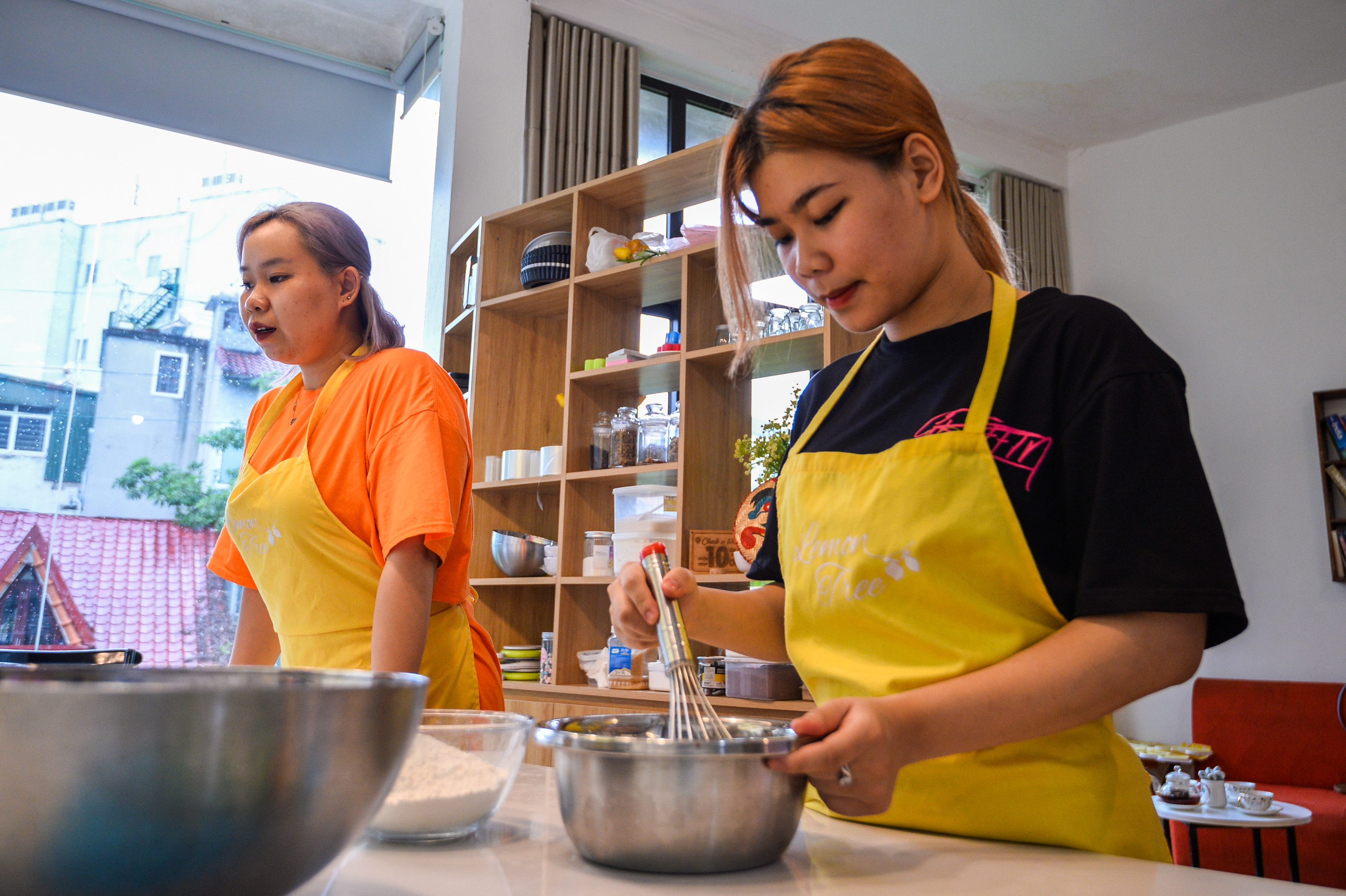 Chỉ còn hai tuần nữa là đến lễ hội trăng rằm 2022, thời điểm này thị trường bánh Trung thu bắt đầu sôi động trên từng con phố. Thay vì mua bánh sẵn, một số bạn trẻ tự làm để tặng bạn bè, người thân.Nhận thấy thị trường bánh ngọt ngày càng cạnh tranh, Nguyễn Thu Trang (28 tuổi) lựa chọn mô hình kinh doanh là mở các khóa học làm bánh ngắn hạn chỉ vài giờ đồng hồ. Người tham gia có thể tự hoàn thiện các sản phẩm ngay tại chỗ và mang về. Mỗi ca thường có từ 4 đến 6 học viên. Từ đầu tháng 8, mỗi ngày tiệm bánh 25m2 của Trang đón các bạn trẻ đến để trải nghiệm dịch vụ tự làm bánh Trung thu. Hầu hết họ tỏ ra thích thú với trải nghiệm mới này. Thùy Dương (bên trái) chia sẻ: "Đây là lần đầu tôi làm bánh Trung thu để tặng bố mẹ. Tự làm mang nhiều ý nghĩa hơn, người nhận quà cũng sẽ thấy thích hơn thay vì mua sẵn".Khi đến đây, người tham gia được hướng dẫn cách làm các loại bánh Trung thu truyền thống như bánh nhân thập cẩm, nhân đậu xanh và nhân sữa dừa. Vì ngày nào cũng có học viên, những nguyên liệu này được Trang chuẩn bị từ trước.