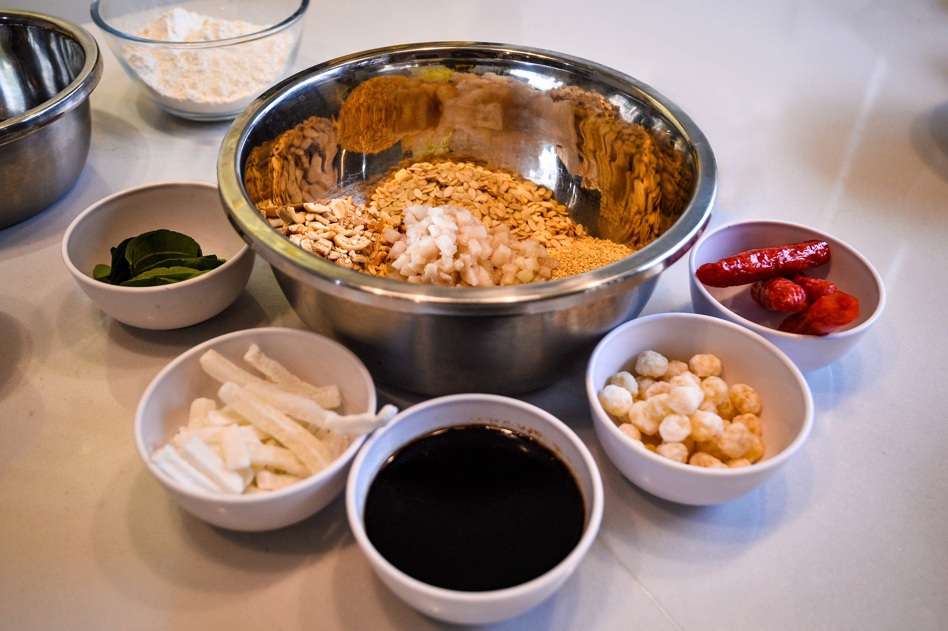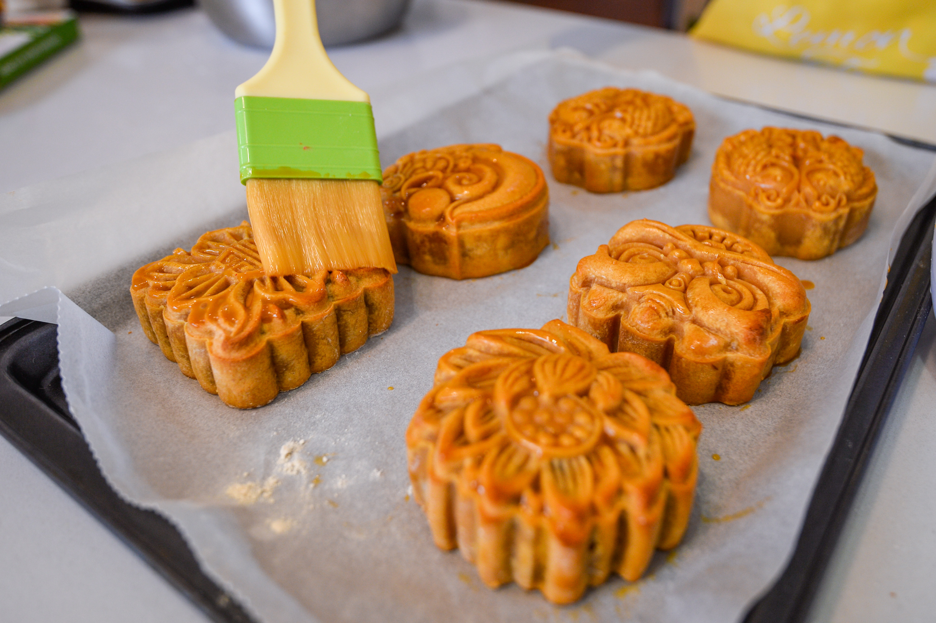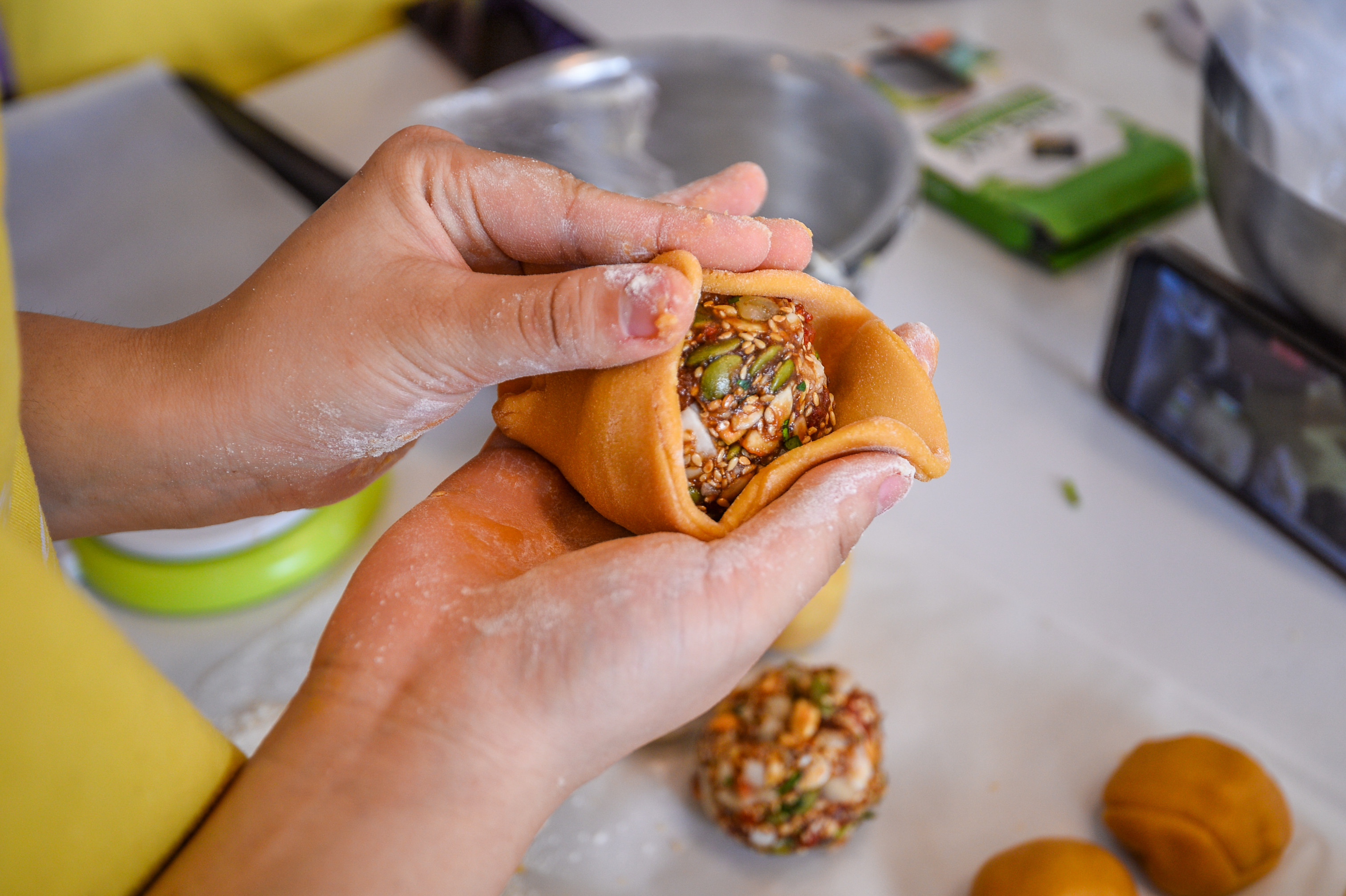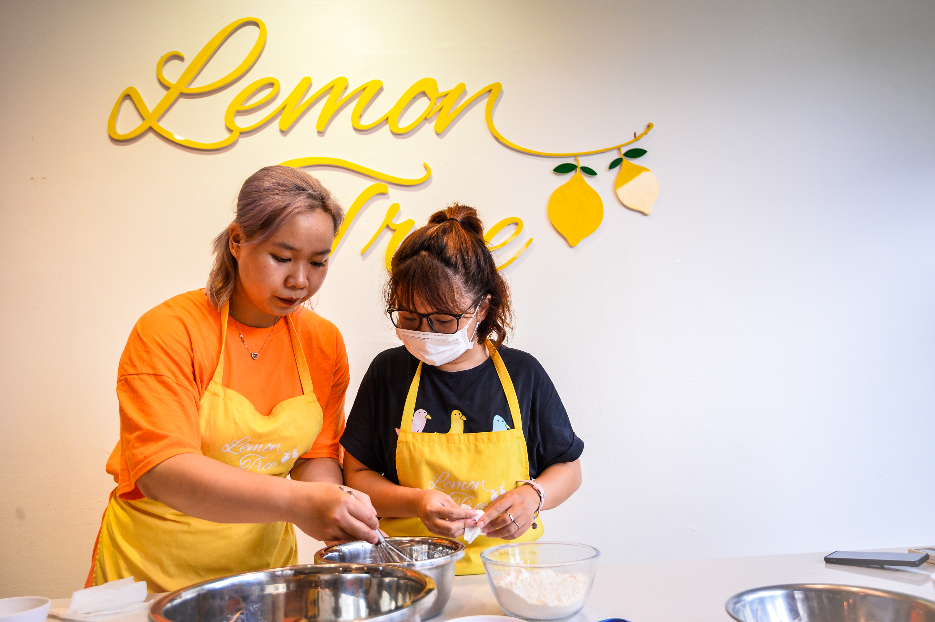 Chỉ còn hai tuần nữa là đến lễ hội trăng rằm 2022, thời điểm này thị trường bánh Trung thu bắt đầu sôi động trên từng con phố. Thay vì mua bánh sẵn, một số bạn trẻ tự làm để tặng bạn bè, người thân.Nhận thấy thị trường bánh ngọt ngày càng cạnh tranh, Nguyễn Thu Trang (28 tuổi) lựa chọn mô hình kinh doanh là mở các khóa học làm bánh ngắn hạn chỉ vài giờ đồng hồ. Người tham gia có thể tự hoàn thiện các sản phẩm ngay tại chỗ và mang về. Mỗi ca thường có từ 4 đến 6 học viên. Từ đầu tháng 8, mỗi ngày tiệm bánh 25m2 của Trang đón các bạn trẻ đến để trải nghiệm dịch vụ tự làm bánh Trung thu. Hầu hết họ tỏ ra thích thú với trải nghiệm mới này. Thùy Dương (bên trái) chia sẻ: "Đây là lần đầu tôi làm bánh Trung thu để tặng bố mẹ. Tự làm mang nhiều ý nghĩa hơn, người nhận quà cũng sẽ thấy thích hơn thay vì mua sẵn".Khi đến đây, người tham gia được hướng dẫn cách làm các loại bánh Trung thu truyền thống như bánh nhân thập cẩm, nhân đậu xanh và nhân sữa dừa. Vì ngày nào cũng có học viên, những nguyên liệu này được Trang chuẩn bị từ trước.