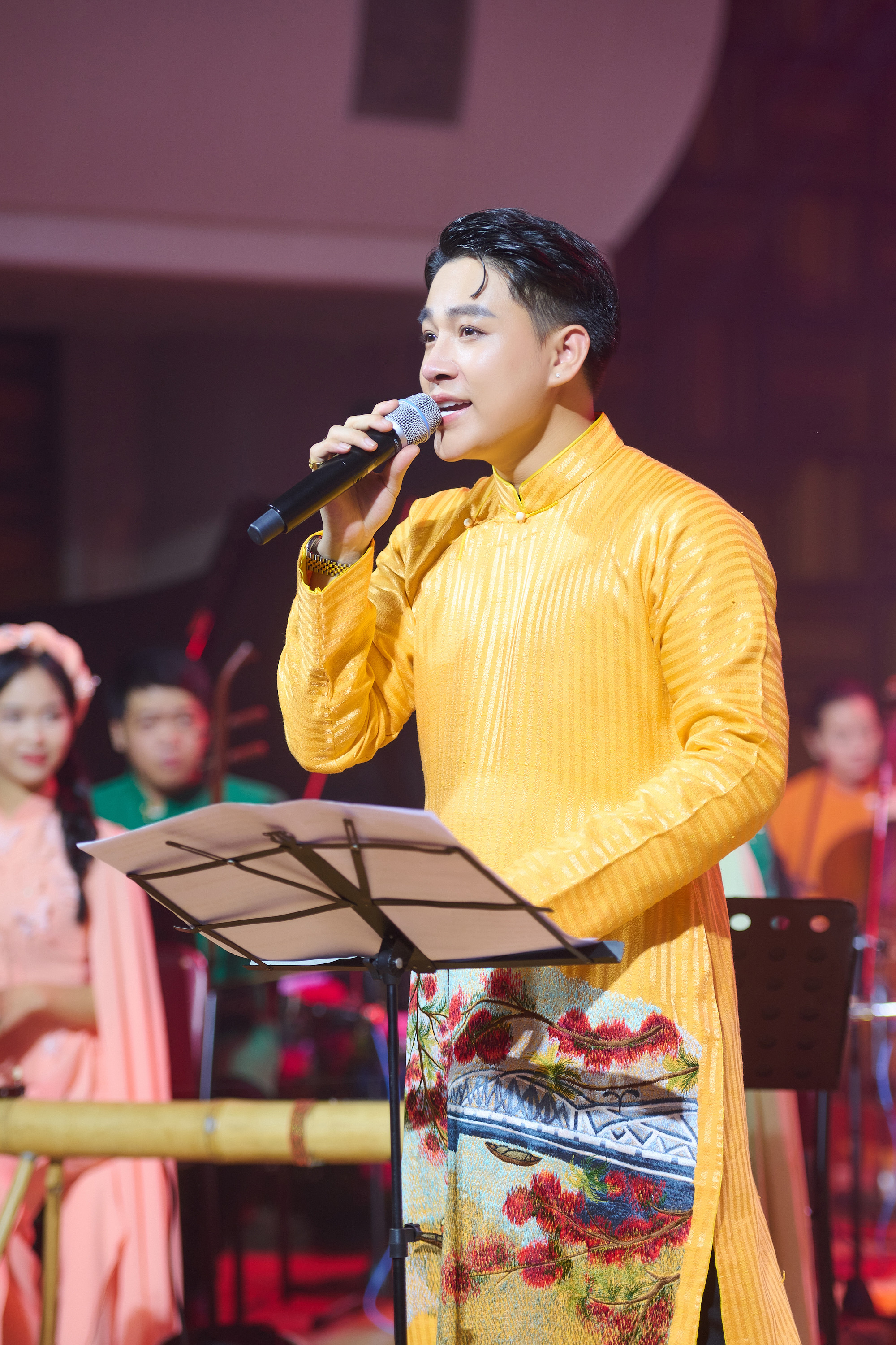 Trong chiếc áo dài vàng in hình cầu Tràng Tiền bắc qua dòng Hương Giang thơ mộng, Trần Tùng Anh khiến cả khán phòng gai người khi khoe giọng nữ mềm mại, ngọt ngào qua ca khúc Nàng thơ xứ Huế.