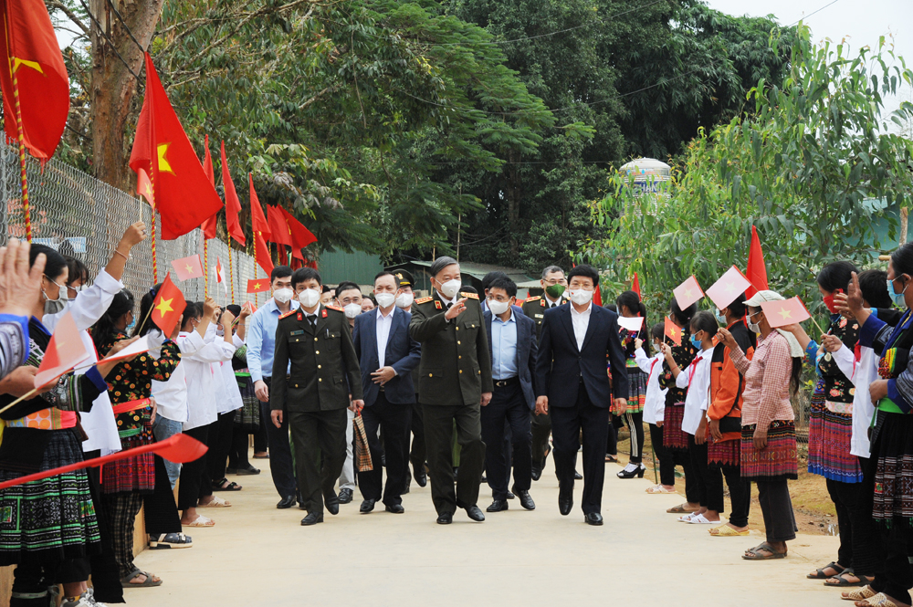Đồng bào các dân tộc tặng Bộ trưởng Tô Lâm chiếc khèn Mông và khăn piêu - món quà mang đậm nét văn hóa dân tộc. |