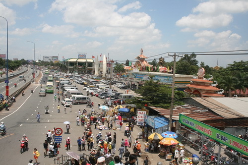 Trong dòng người đổ về tràn ngập cả phía trước khu du lịch Suối Tiên, lực lượng bán hàng rong, bán nước giải khát chen nhau mời chào rất bát nháo. Những biển cấm bán hàng rong dường như chẳng có hiệu lực gì và chúng tôi cũng đã kịp ghi lại hình ảnh thân thiện giữ người bán hàng rong và anh bảo vệ công viên vui vẻ bên nhau.