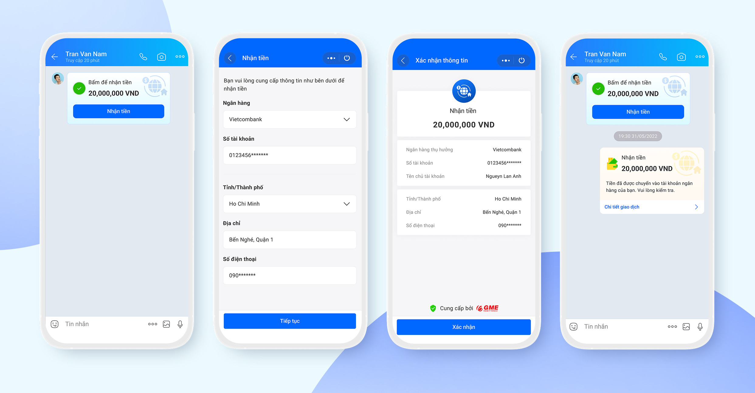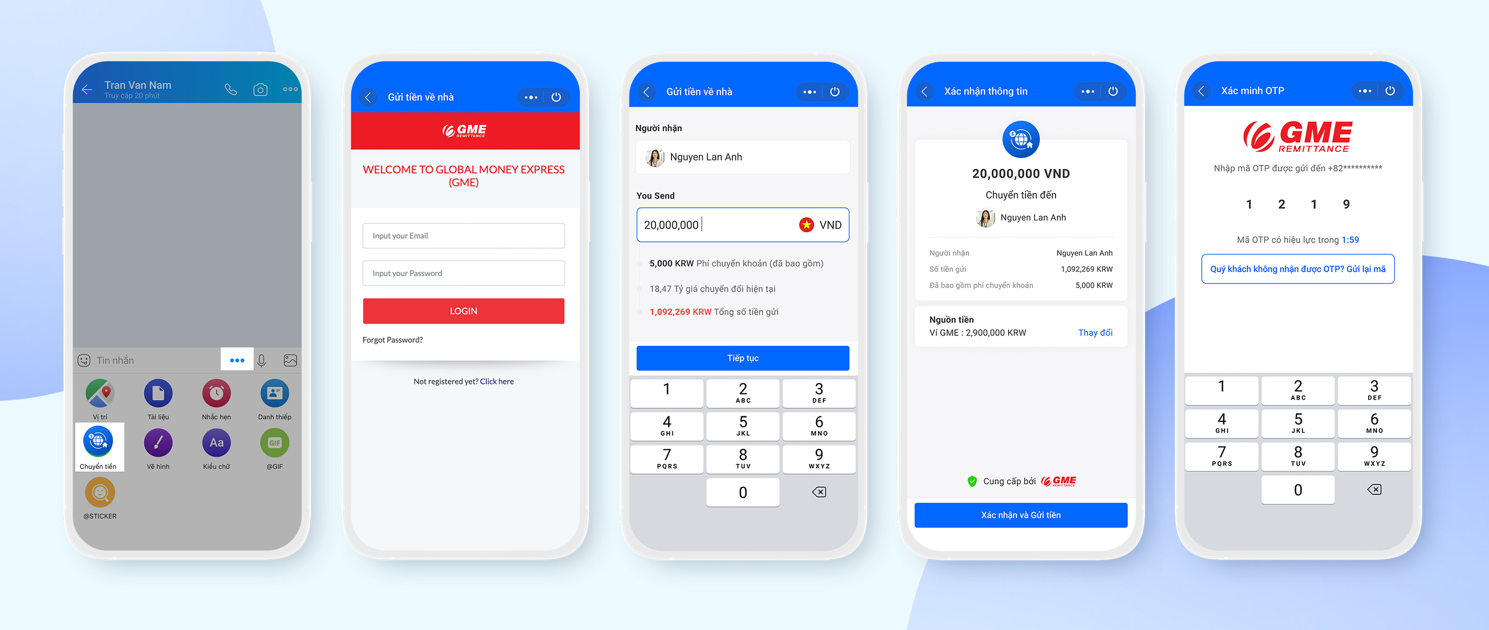 Dịch vụ chuyển tiền quốc tế của GME ngay trong khung chat Zalo đáp ứng nhu cầu vừa nhắn tin trò chuyện với người thân, vừa thực hiện giao dịch chuyển tiền trên một cửa sổ cửa sổ màn hình.
