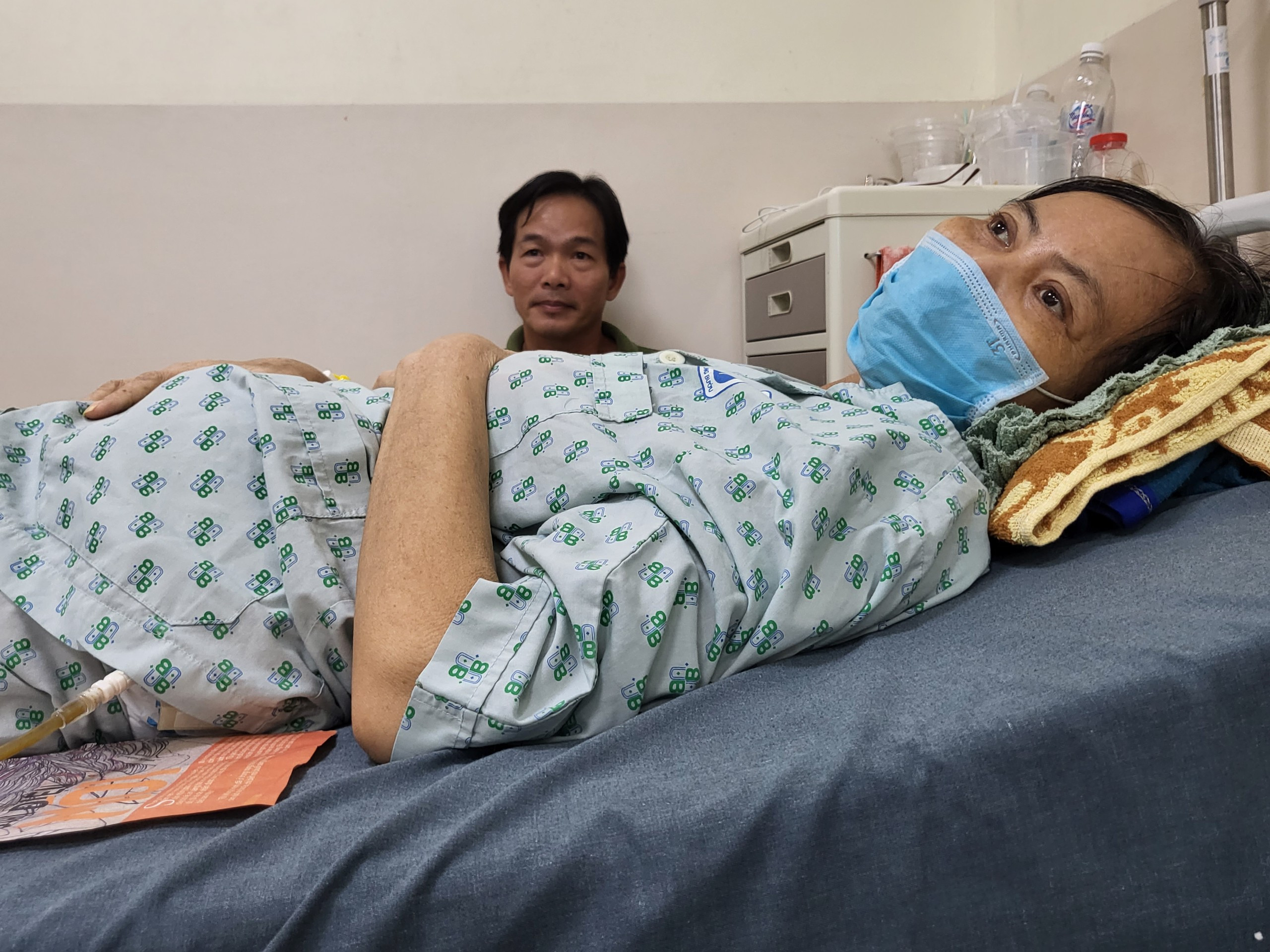 Một phụ nữ 48 tuổi (Bến Tre) bị ung thư trực tràng, mang theo vết sẹo phẫu thuật trước bụng, chân teo lại. Sau 3 năm điều trị, vợ chồng chị không còn đếm đã tốn bao nhiêu tiền chữa bệnh, vì "đếm không nổi". Để theo đúng phác đồ mà giảm bớt chi tiêu, anh chị ở nhờ mái ấm sát bệnh viện.