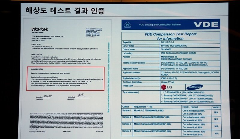Các đại diện của LG, bao gồm ông Park, đều phát biểu tại cuộc họp báo trong khuôn khổ triển lãm công nghệ IFA 2019 hôm 7/9. Họ cho biết cơ quan chứng nhận và kiểm tra sản phẩm Intertek và VDE đã kiểm tra tivi 8K của Samsung, LG và Sony. Kết quả cho thấy tivi QLED 8K của Samsung có giá trị điều chỉnh tương phản (CM – contrast modulation) là 12%, trong khi mốc tiêu chuẩn để được chứng nhận độ phân giải 8K là 50%.