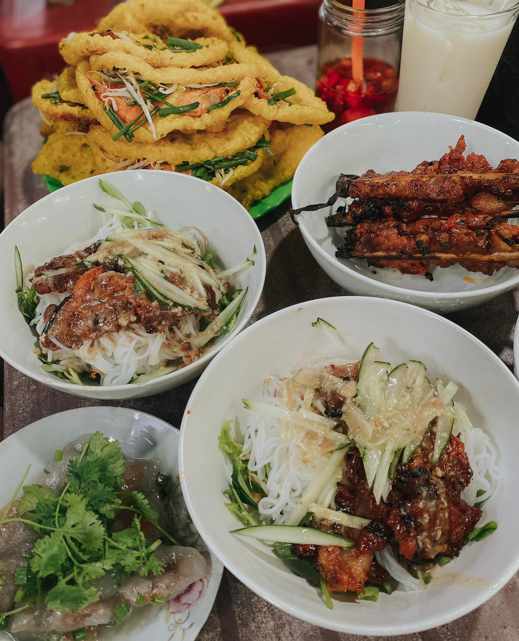 Bánh bèo mềm mịn, ăn kèm tóp mỡ giòn rụm, hành phi thơm nức và chấm mắm ớt xanh tại quán Hạnh, đường Phó Đức Chính (Phú Hội, TP Huế). Quán nằm ngay trung tâm thành phố, vị trí rất dễ tìm. Tại đây có nhiều món ăn truyền thống của Huế như bánh bèo, bột lọc, nem lụi...Theo chia sẻ của Hằng, cả nhóm 4 thành viên thưởng thức nhiều món khác nhau tại quán này nhưng chi phí chưa tới 500.000 đồngBánh đa xúc hến vừa miệng ở cổng chợ Đông Ba. Các quán ở khu vực này có mức giá khá rẻ. Bún hến, cơm hến chỉ khoảng 15.000 đồng/tô Xung quanh khu chợ Đông Ba có nhiều món ngon, du khách đến đây có thể nhờ người dân "chỉ điểm". "Mình không nhớ hết tên các quán quanh chợ nhưng mình rất ấn tượng với hương vị thịt nướng tại đây, đậm đà, thơm nức và miếng thịt vô cùng mềm", Hằng chia sẻ. Ở đây mỗi xiên thịt nướng có giá chỉ 10.000 đồng.Tại chợ cũng có nhiều hàng mực rim me, tôm chua, cá bò... Tuy nhiên du khách nên tìm hiểu trước về giá thành trước khi tới mua.Tô bún hến "nhỏ nhưng có võ". Món ăn đường phố quen thuộc tại Huế làm từ những gia vị quen thuộc như hến, lạc rang, tóp mỡ, giá đỗ, rau thơm nhưng lại mang tới hương vị hấp dẫn khác lạ với du khách.Ngày thứ hai ở Huế, Hằng thưởng thức bún bò tại địa chỉ được chủ homestay giới thiệu - quán O Tuyết trên đường Nguyễn Công Trứ. "Tô bún ở đây rất đầy đặn, nhiều thịt lắm. Quầy thịt tươi nằm ngay nơi chế biến, khách gọi tới đâu, nhân viên thái tới đó. Sợi bún nhỏ, nước dùng ngon, ăn với ớt xanh rất thơm", Hằng chia sẻVới bánh canh, Hằng rất thích hương vị tại quán O Bướm và một quán trên đường Phạm Hồng Thái.Quán O Lé (Kim Long, Huế) tuy hơi khó tìm vì nằm trong ngõ sâu nhưng có không gian nhà vườn yên bình, chủ quán thân thiện. Ở đây có nhiều món Huế rất ngon như ram ít, bột lọc, bánh nậm, bánh bèo... Bánh có bột béo ngậy mịn màng, nhân tôm thịt được nêm nếm vị vừa ăn cùng nước chấm đậm đà. Giá thành các món ăn ở đây đều khá rẻ, từ 20.000 - 40.000 đồng/phần.