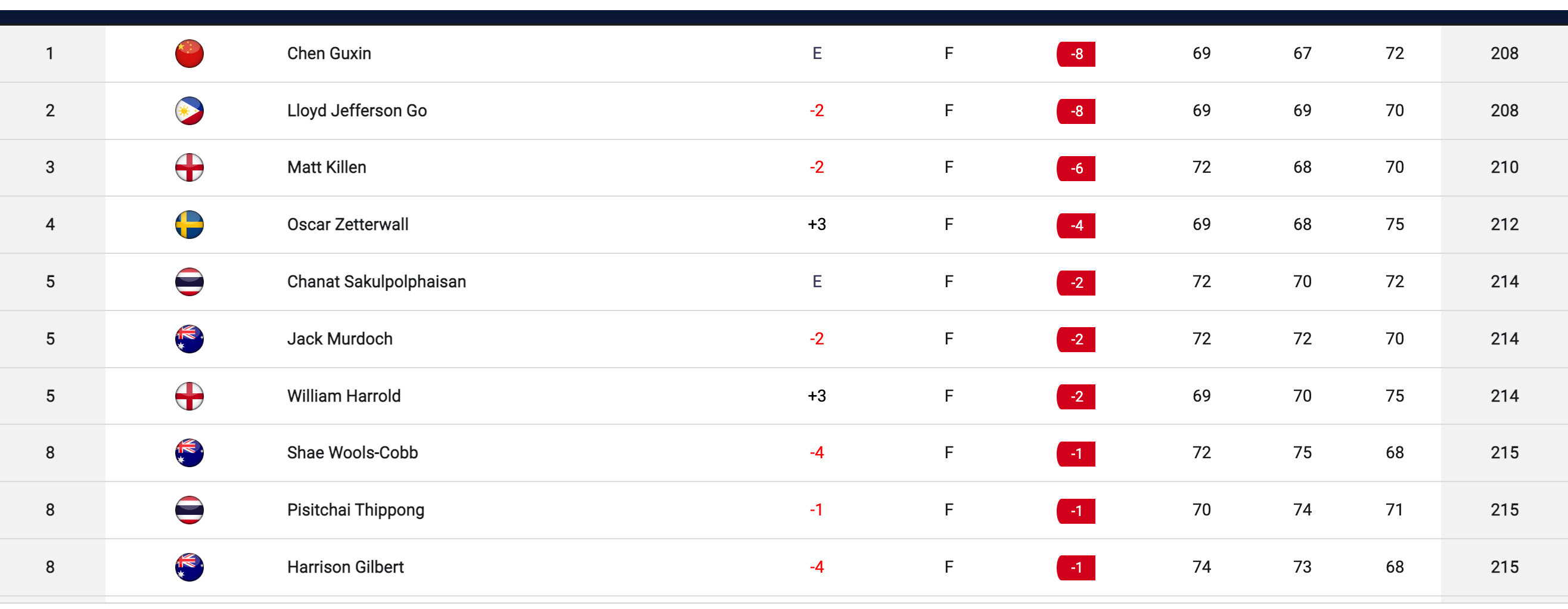 Trong khi đó, Chen Guxin dù có sự khởi đầu không tốt và liên tục mắc bogey, nhưng kịp lấy lại phong độ với 3 điểm birdie ở hố 15, 17 và 18. Kịch tính xảy ra khi Chen Guxin có cùng số gậy với Lloyd Jefferson Go (-8) buộc hai VĐV này phải đấu play-off ở hố 18. Lloyd Jefferson Go không may mắn đánh bóng xuống nước, và chức vô địch thuộc về Chen Guxin với điểm par.