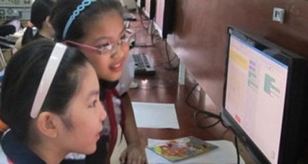 | Các em học sinh trường tiểu học Bế Văn Đàn (Thanh Khê, Đà Nẵng) đang chơi máy tính khi kỹ sư phần mềm của Google đến thăm quan. |