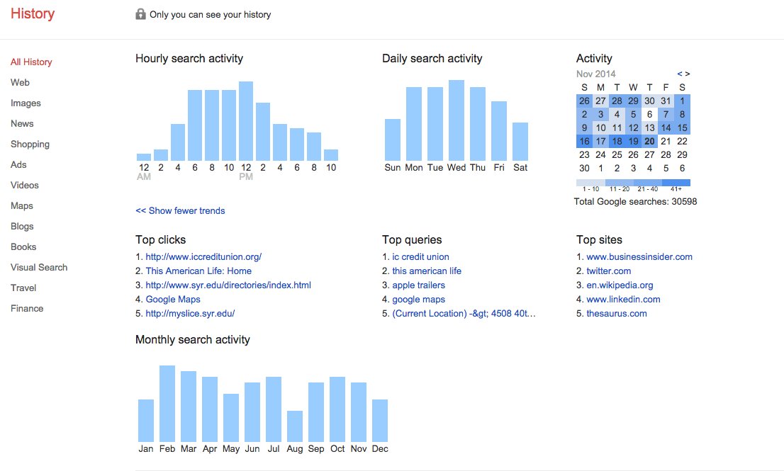 Google theo dõi từ khóa tìm kiếm của bạn nếu bật tính năng Search History. Trang này hiển thị những trang web bạn click vào nhiều nhất, những từ khóa tìm nhiều nhất.