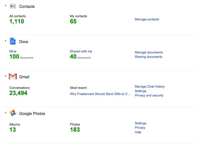 Muốn biết bạn gửi đi bao nhiêu email mỗi ngày hay số liên hệ mà bạn có? Google cũng theo dõi cả chúng. Truy cập vào Dashboard để biết điều này. Trang tổng quan hiển thị cả album ảnh, số lượng ứng dụng tải về, cảnh báo thiết lập…
