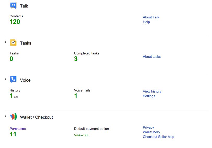 Thông tin về Google Talk, Google Wallet cũng được hiển thị trên Dashboard.