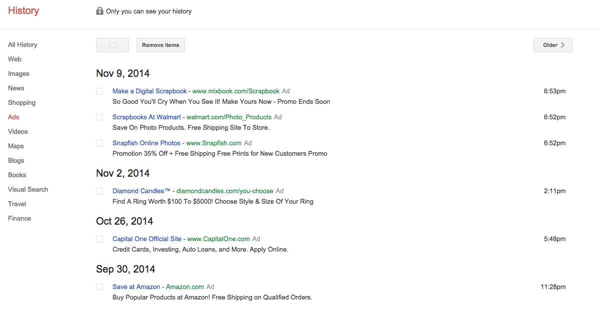 Cột bên trái được chia theo danh mục như video, bản đồ, blog, quảng cáo. Bạn có thể click vào Ads để xem mình đã nhấp chuột vào quảng cáo nào.