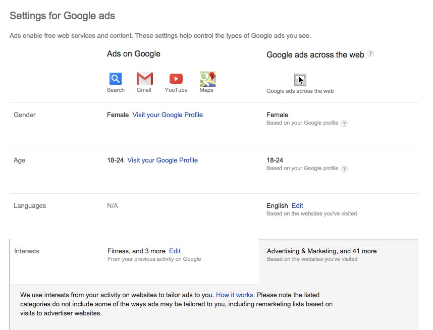 Google có thể cung cấp quảng cáo theo mối quan tâm vì họ sở hữu nhiều dữ liệu về bạn như độ tuổi, giới tính, ngôn ngữ, mối quan tâm. Click vào đây nếu muốn xem thông tin phục vụ quảng cáo của Google.
