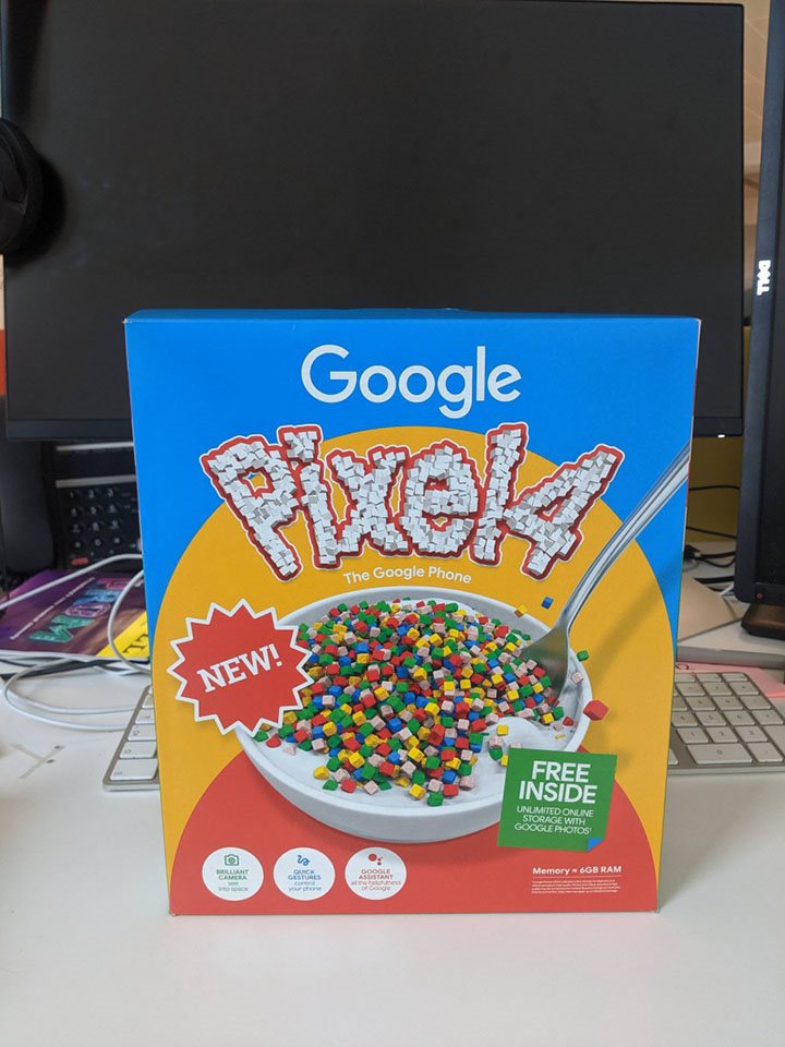Bên ngoài chiếc hộp vẫn in số RAM, Google Assistant, Camera, điều khiển bằng cử chỉ, tuy nhiên thay vì để hình của Pixel 4 thì Google lại in một chén ngũ cốc ăn với sữa
