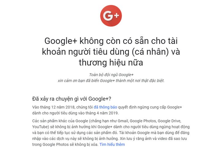 Trong thông báo của Google đăng vào cuối tháng 1/2019 viết: "Vào ngày 2/4, tài khoản Google+ và mọi trang Google+ mà bạn đã từng tạo sẽ dừng hoạt động và chúng tôi sẽ bắt đầu xóa nội dung liên quan đến tài khoản Google của người dùng".