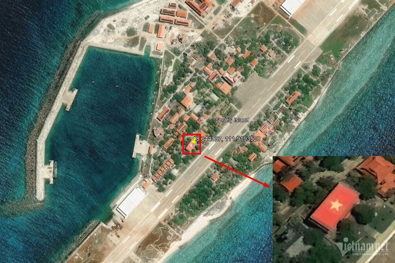 Độc giả quan tâm có thể tìm đến vị trí lá cờ khổng lồ trên nóc nhà hội trường đảo Trường Sa Lớn tại tọa độ 8.644137, 111.9193520.