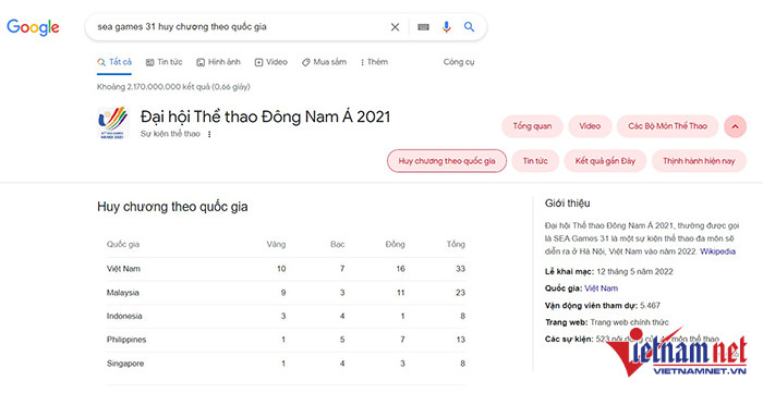 Cụ thể, khi tìm kiếm từ khoá “SEA Games 31” trên Google, người dùng sẽ dễ dàng tìm thấy thông tin mới nhất về các trận đấu, môn thể thao và tuyển thủ yêu thích. Thậm chí, người dùng còn có thể xem bảng tổng sắp huy chương ngay tại trang tìm kiếm của Google và thứ hạng của quốc gia mình.