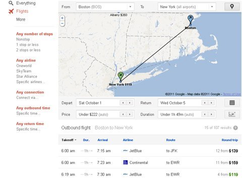 | Một góc kết quả khi tìm các chuyến bay từ Boston đi New York. |