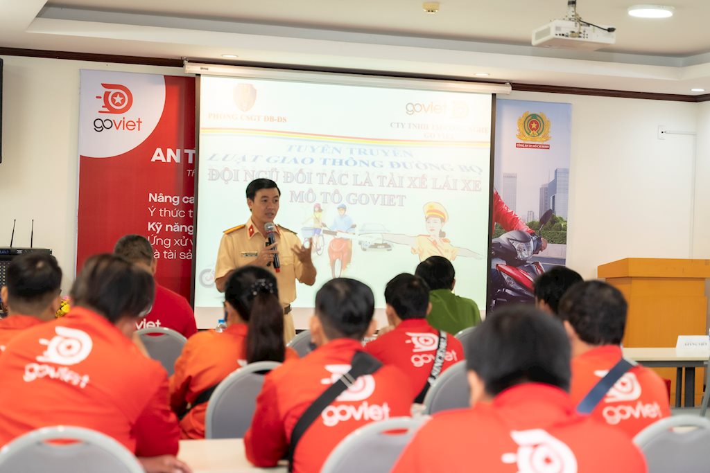 Đại diện phía công an Thành phố cũng bổ sung kiến thức và kỹ năng cho các đối tác tài xế GoViet về kiến thức pháp luật trong lĩnh vực an toàn giao thông với những nội dung gắn liền với các hoạt động thường xuyên của đối tác tài xế trong việc chấp hành các quy tắc giao thông đường bộ như: lưu thông đúng phần đường, làn đường; tuân thủ hệ thống biển báo hiệu giao thông, đèn tín hiệu giao thông, không đi quá tốc độ, không lái xe khi đã sử dụng rượu bia. Trong đó cập nhật những điểm mới, thay đổi của Nghị định 100/2019/NĐ-CP có hiệu lực từ ngày 01/01/2020 so với Nghị định 46/2016/NĐ-CP mà các tài xế lái xe cần lưu ý. Chia sẻ kinh nghiệm, kỹ năng lái xe trên đường như kiểm tra phương tiện trước khi lưu thông, các bước chuyển hướng an toàn,… đặc biệt là khi lưu thông giao thông trong những khung giờ cao điểm. Giảm thiểu những rủi ro liên quan tới tính mạng, sức khỏe, tài sản của đối tác tài xế đồng thời tăng cường hành vi ứng xử văn minh của đối tác tài xế và khách hàng. Mục tiêu chính được đặt ra là đảm bảo 100% các đối tác tài xế sau khi được tập huấn sẽ nghiêm chỉnh chấp hành các quy định về an toàn giao thông.