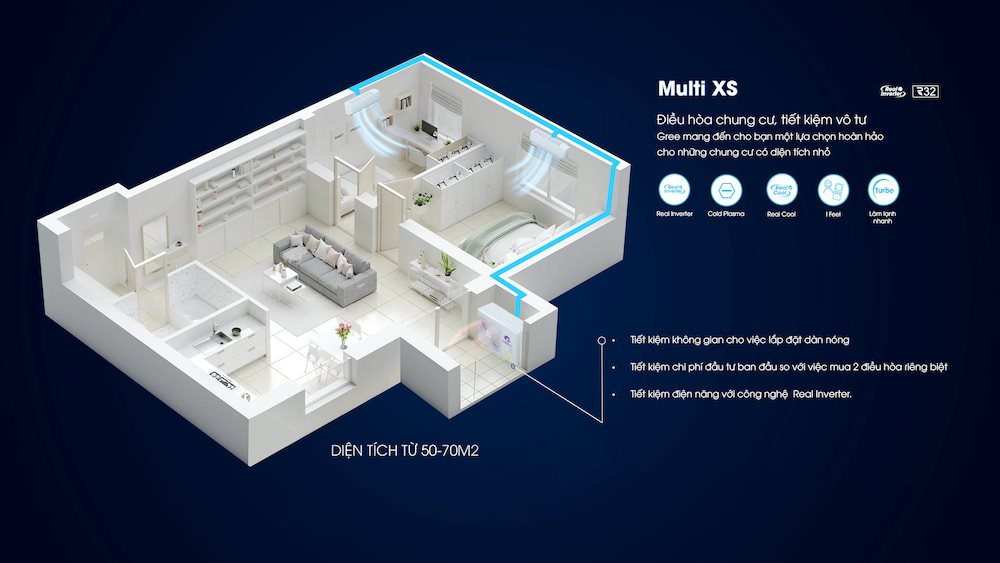 Phần lớn các căn hộ chung cư không có ban công hoặc ban công rất hẹp, gây khó khăn trong việc lắp đặt điều hòa từ 2 dàn nóng trở lên. Để giải quyết hạn chế này, Gree trình làng điều hòa thế hệ mới Multi-XS (Extra-Saving).