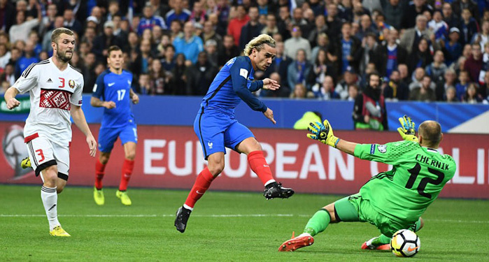 Bàn thắng: Griezmann 27', Giroud 33' - Saroka (44')