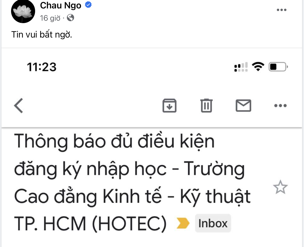 Theo đó, GS Châu chia sẻ hình ảnh email thông báo trúng tuyển của Trường CĐ Kinh tế kỹ thuật TP.HCM: "Thông báo đủ điều kiện đăng ký nhập học – Trường CĐ Kinh tế kỹ thuật TP.HCM (HOTEC)" do phòng tuyển sinh của trường gửi.