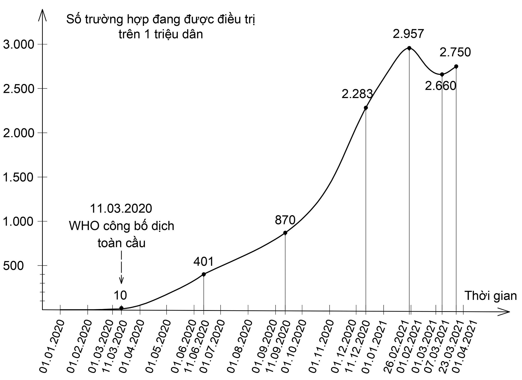 Ngày 11/3/2020, khi WHO tuyên bố dịch toàn cầu, có 8,65 người đang được điều trị trên 1 triệu dân toàn thế giới. Sau 11.03.2020, số người đang được điều trị trên 1 triệu dân đã tăng không ngừng, lên 401 ngày 11/6/2020, 870 ngày 11/9/2020, 2.283 ngày 11/121/2020, 2.957 ngày 26.01.2021, sau đó giảm xuống 2.660 ngày 0/3/2021 và lại tăng lên 2.750 ngày 23/3/2021, Hình 01.