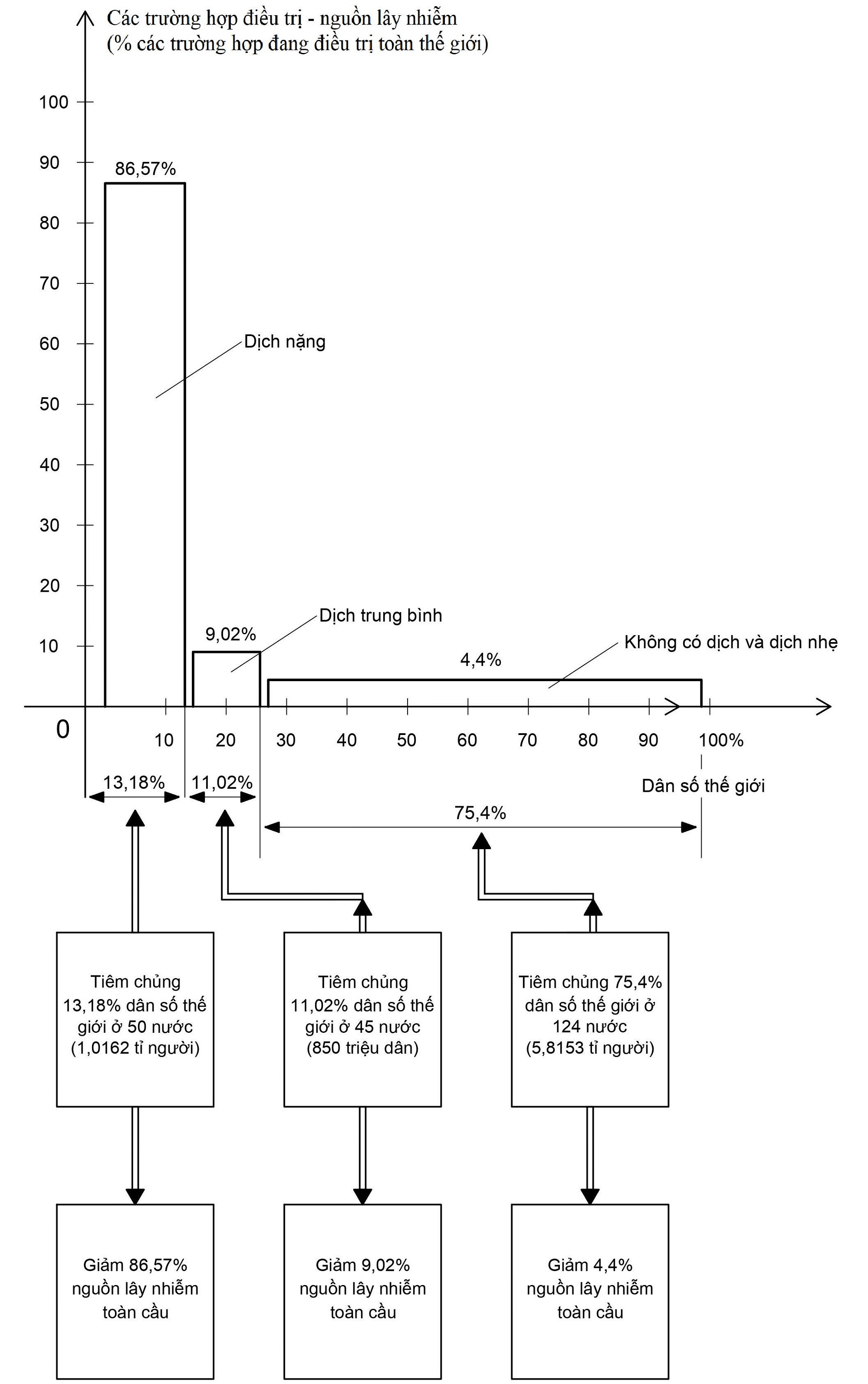 Chúng ta đã thấy ở trên là nguồn lây nhiễm Covid-19 - những người đang điều trị ở các bệnh viện mỗi ngày không phân bổ đồng đều mà rất không đồng đều theo dân số (Hình 2). Hình 2 chỉ ra sự phân bổ không tương ứng dân số của các nguồn lây nhiễm - những người đang điều trị ở bệnh viện. 86,57% nguồn lây nhiễm của thế giới nằm ở 50 nước và vùng lãnh thổ “có dịch nặng”, chiếm chỉ 13,5% dân số thế giới (1,0163 tỉ người). Nếu chúng ta tiêm phòng bao phủ (70% - 100% dân số) các nước này thì chúng ta có thể giảm 86,57% nguồn lây nhiễm toàn thế giới. Tức là 1 triệu người đã được tiêm đủ liều sẽ giúp giảm 11.772 người đang điều trị ở các bệnh viện.