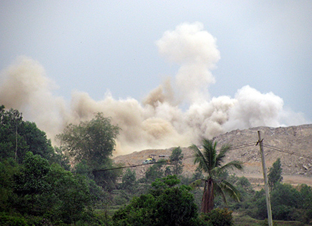 Chừng hơn 5 phút sau, trời đất như rúng động bởi hàng loạt tiếng nổ rền trời. Tiếng đá bay ào ào trên núi, khói bụi cuộn đỏ thành cột khổng lồ, dựng đứng, rồi theo gió ập xuống thung lũng, phủ lan khắp hàng trăm mái nhà dân ở Phước Hậu và Phước Thuận. Khách lạ như tôi bị một phen kinh hồn, nhưng người dân nơi này lại dửng dưng. “Sống ở đây như giữa lòng chiến trường. Quen rồi chú ạ” - cựu Thôn trưởng Phước Hậu - ông Lê Mẫn - chua chát nói với tôi.