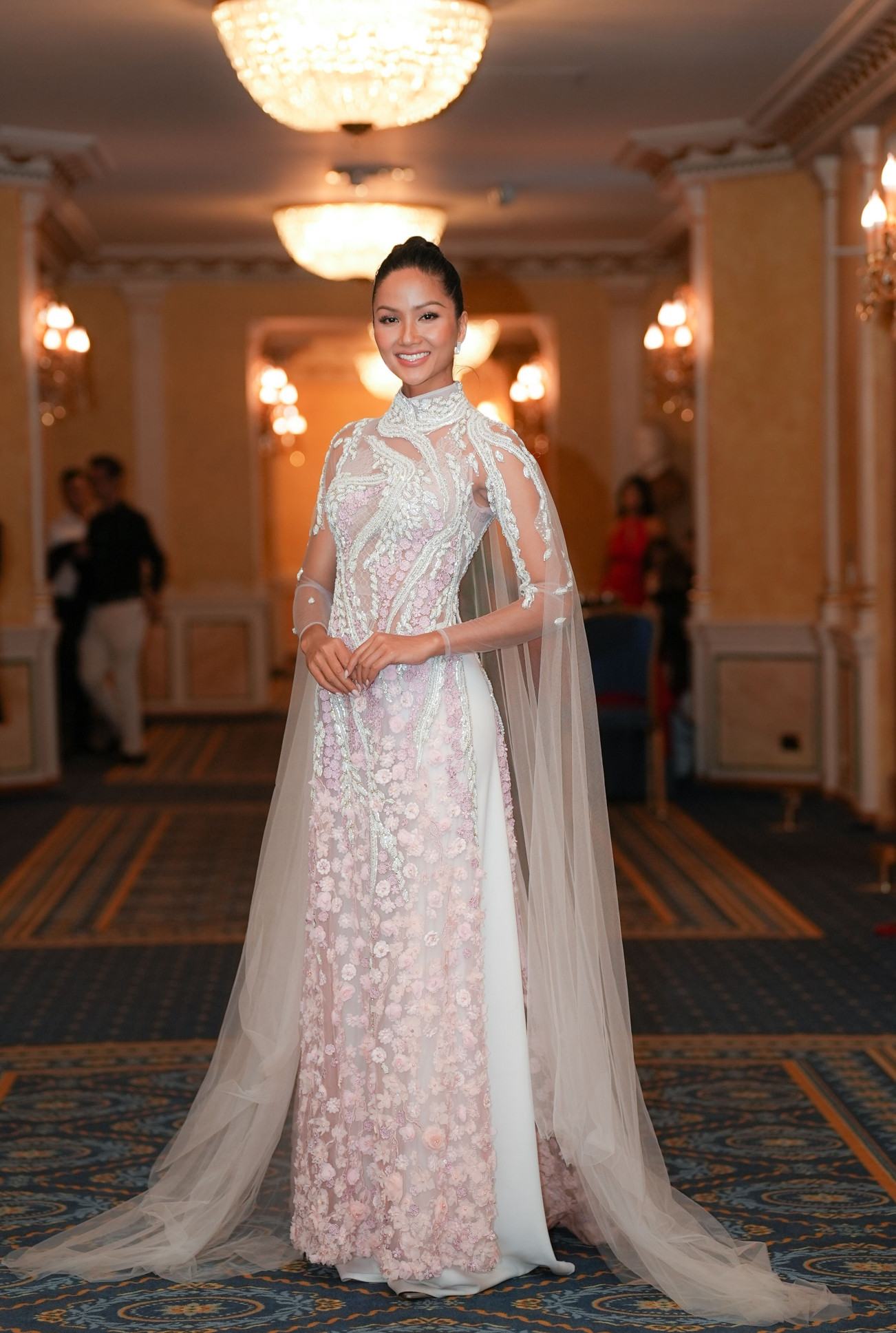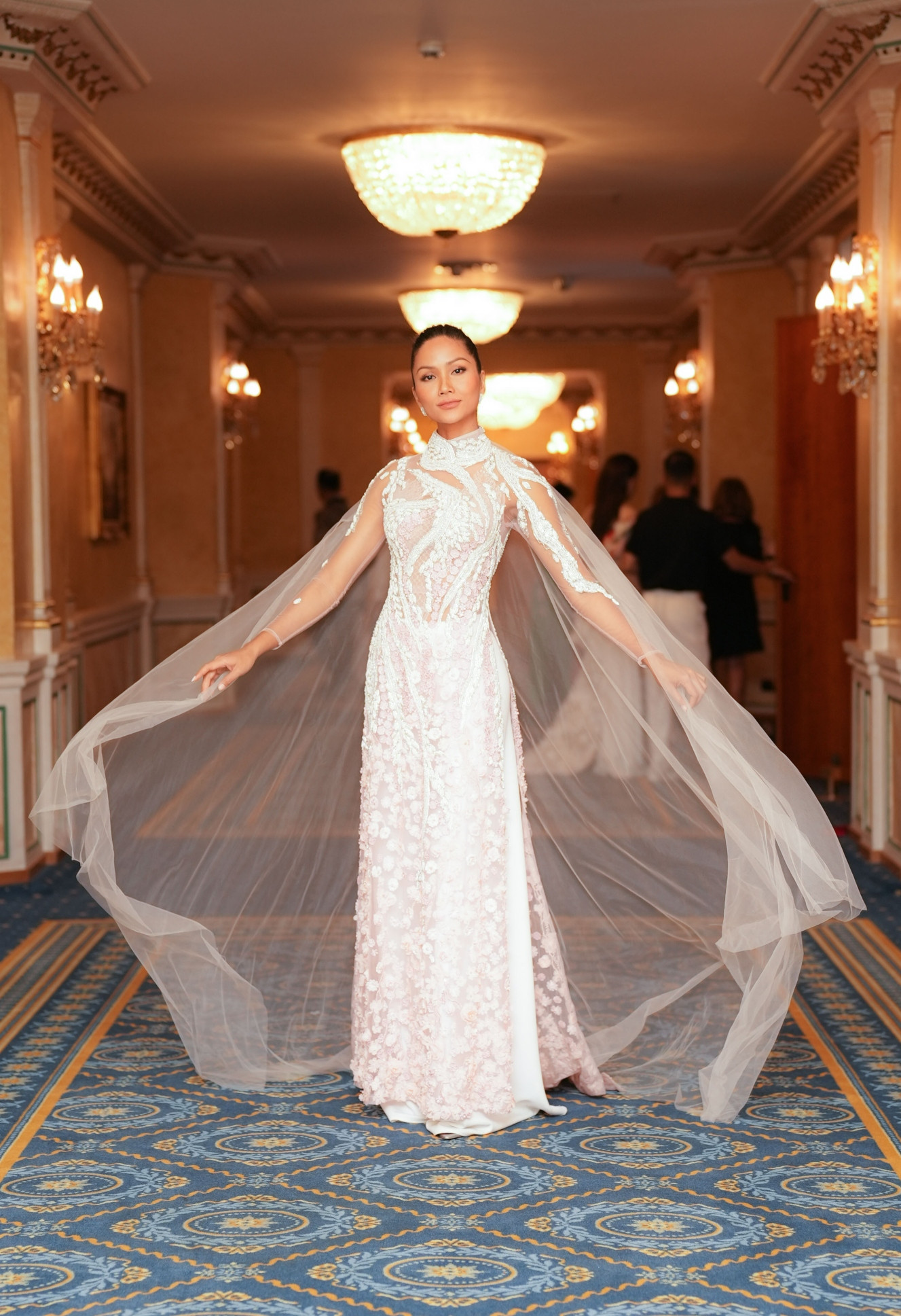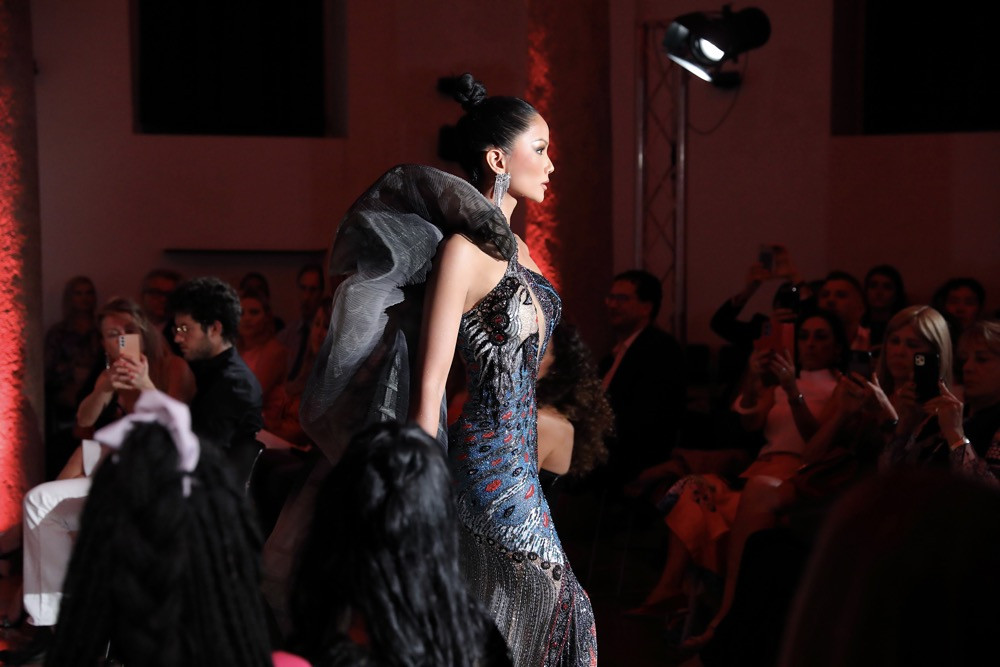 H'Hen Niê vừa đảm nhiệm vai trò vedette trong BST mới nhất của Hoàng Hải tại Milano trong chuyến công tác tại Ý. Nàng hậu diện bộ váy dạ hội mềm mại khoe đường cong gợi cảm với kỹ năng trình diễn nổi bật và chuyên nghiệp.H’Hen Niê xử lý váy thanh lịch và khéo léo, tự tin sải bước trên sàn diễn.Tại đây, H'hen Niê được tham dự sự kiện kỷ niệm 77 năm Quốc khánh nước CHXHCN Việt Nam do Đại sứ quán Việt Nam tại Ý tổ chức.Nàng hậu chọn tà áo dài trắng, tóc búi cao cùng lối trang điểm nhẹ nhàng tôn lên từng đường nét trên gương mặt.H'Hen Niê vinh dự khi có cơ hội đến thăm và tham dự lễ kỷ niệm 77 năm Quốc khánh nước CHXHCN Việt Nam trong chuyến công tác lần này.“Bên cạnh đó, Hen cũng đã gặp gỡ và giới thiệu nét đẹp văn hoá Việt Nam với bạn bè quốc tế thông qua tà áo dài được đính kết rất đẹp của anh Hoàng Hải mà Hen đã diện trong lần này”, hoa hậu người Ê Đê chia sẻ.H'Hen Niê cho biết sẽ có những ngày trải nghiệm và khám phá nhiều đất nước khác ở Châu Âu trong chuyến công tác này và sẽ liên tục cập nhật các hoạt động thú vị để chia sẻ cùng khán giả.