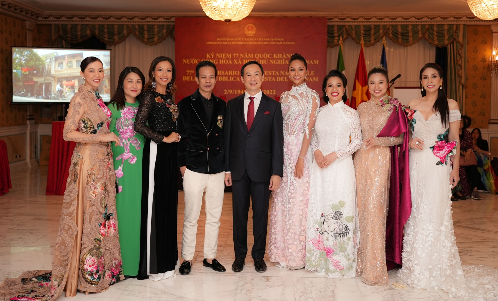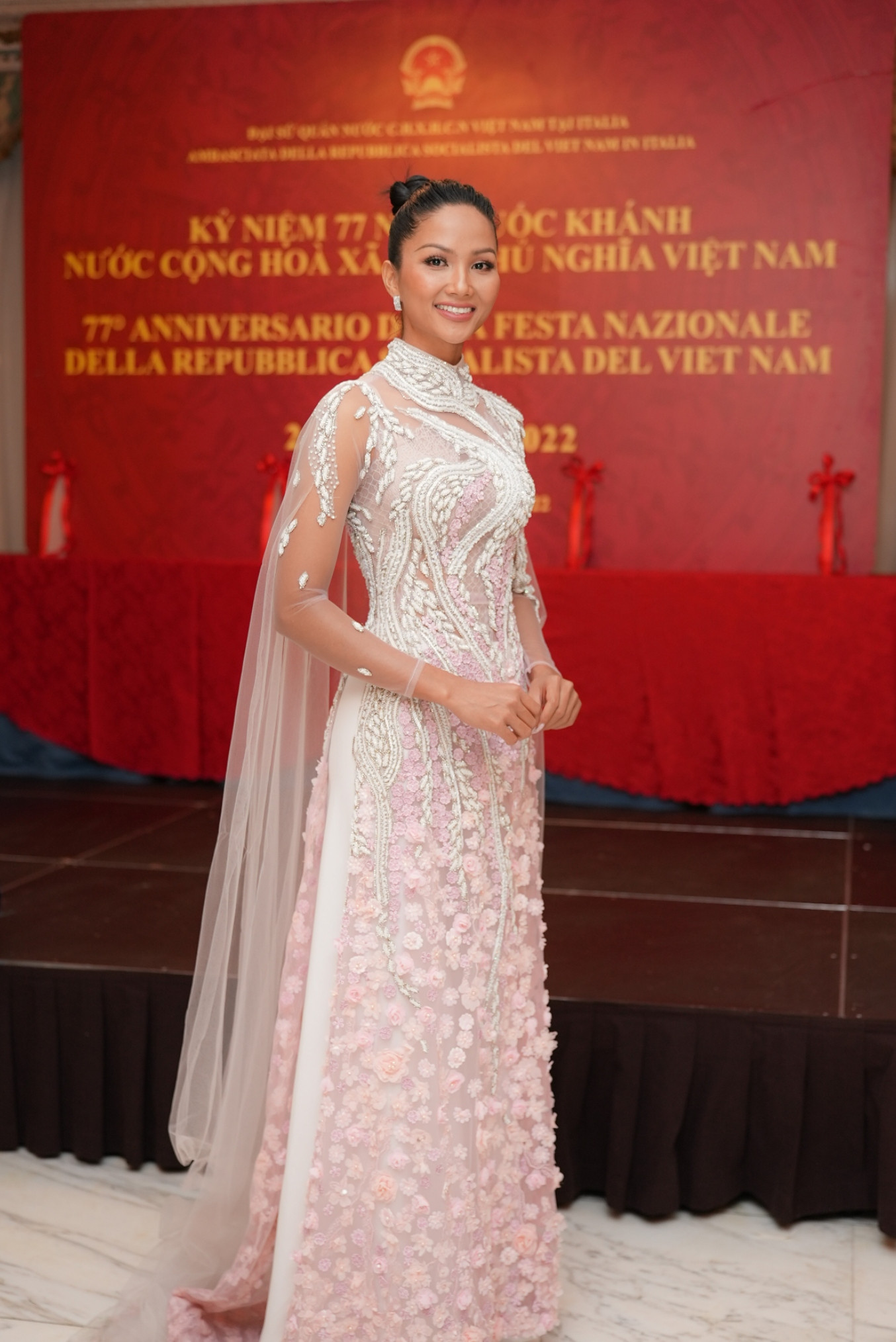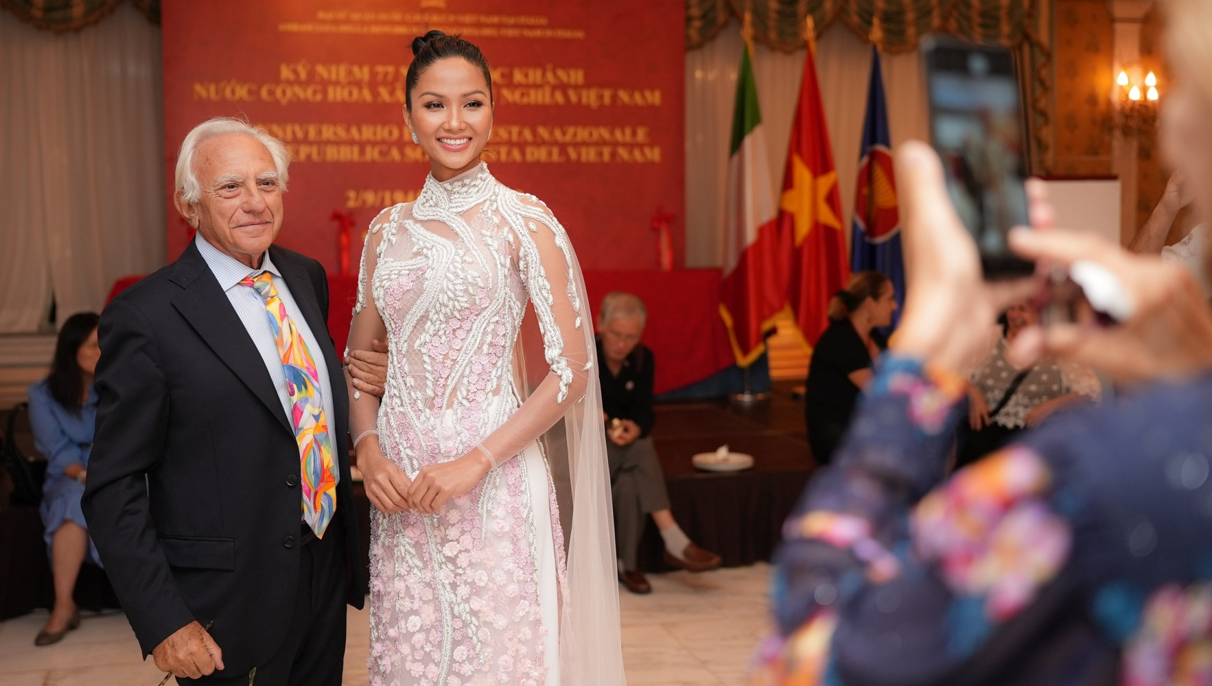 H’Hen Niê diện áo dài trắng tham dự lễ kỷ niệm 77 năm Quốc khánh nước CHXHCN Việt Nam do Đại sứ quán Việt Nam tại Italy tổ chức.