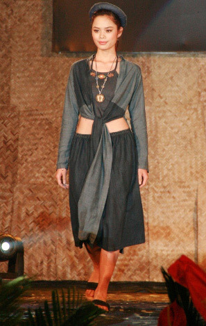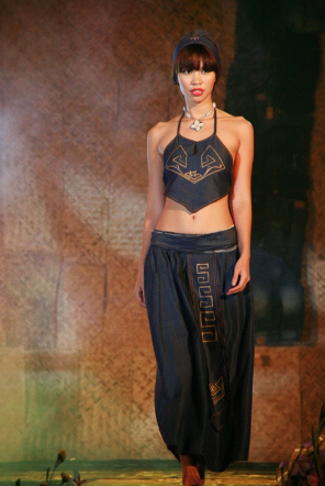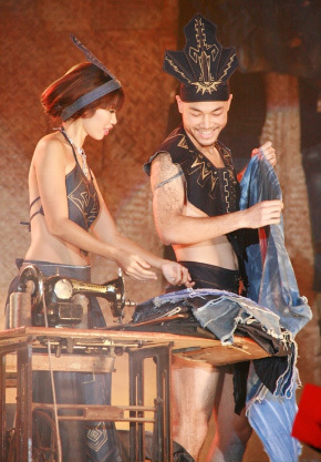 | Trong khi Hà Anh đi guốc mộc diện áo yếm làm từ jean thì Doãn Tuấn lại chân trần váy khố lãng tử và nam tính. |