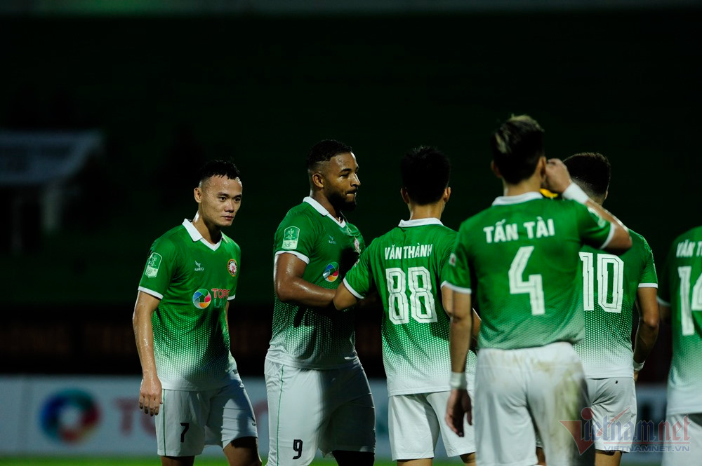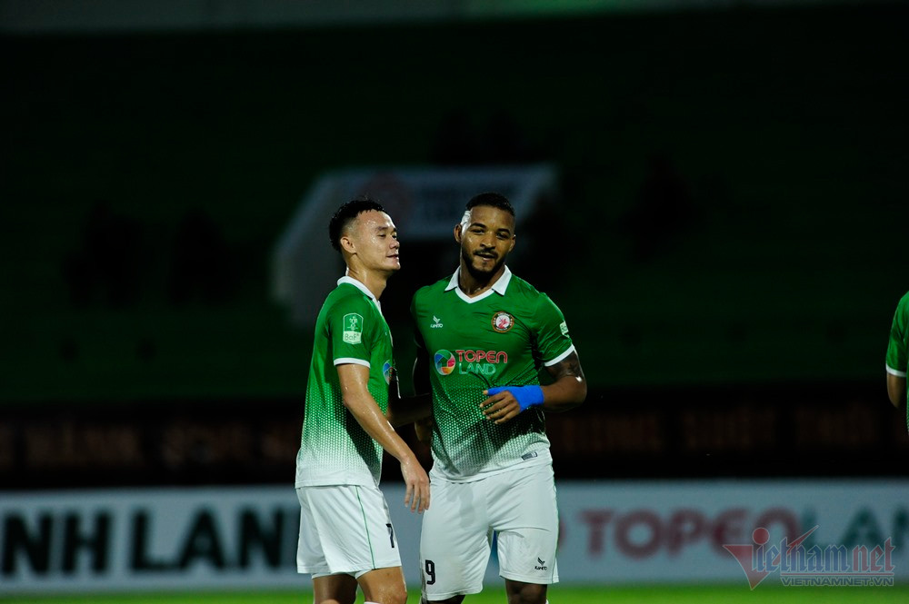 Sân Quy Nhơn, Bình Định mở tỉ số: Từ quả tạt của Thanh Thịnh bên cánh trái, Hồ Tấn Tài rướn người dứt điểm để Rafaelson chạm bóng cận thành làm tung lưới Thanh Hóa.
