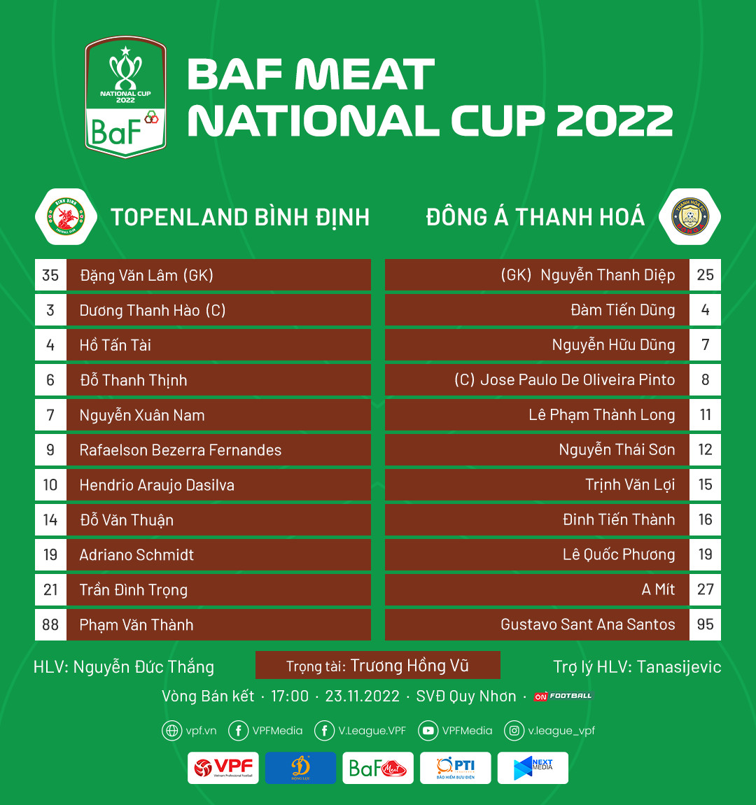 Trong khi ấy, tại SVĐ Quy Nhơn, đội chủ nhà Topenland Bình Định tuy vừa ăn mừng HCĐ V.League 1 nhưng hẳn cũng vẫn tràn đầy khao khát có thêm chiếc Cúp QG làm quà tặng người hâm mộ và các đối tác của họ. Khoảng cách tới 19 điểm giữa 2 đội tại V.League 1 (47 so với 28 điểm) vừa qua chỉ mang tính tham khảo vì Cúp quốc gia vốn mang tính chất rất khác (loại trực tiếp thay vì tính điểm sau nhiều vòng đấu). Bởi vậy, khi nhìn lại 2 trận đối đầu trực tiếp tại V.League 1 (mỗi đội thắng 1 trận khi đá tại sân nhà) thì đây quả là một cặp đấu khó lường.