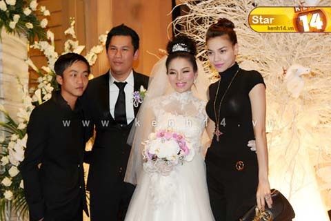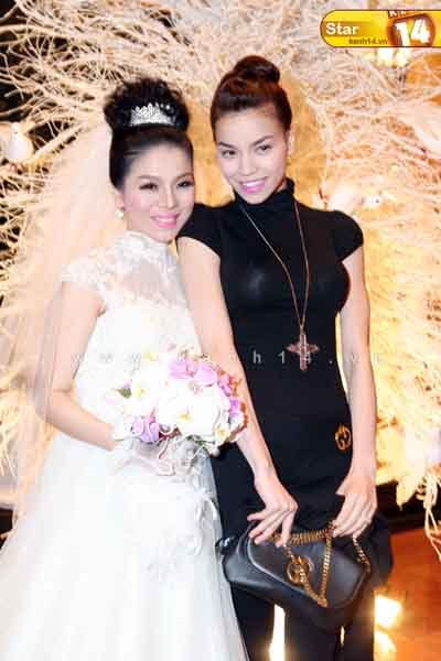 Hồ Ngọc Hà là bạn thân của Lệ Quyên trong giới showbiz. Trong ngày vu quy của bạn, Hà Hồ đẹp rạng rỡ và tay trong tay “ông xã” Cường Đôla đến chúc mừng.