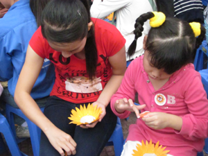 | Các bạn tình nguyện viên chung tay gấp 10.000 bông hoa hướng dương vì bệnh nhi ung thư. |