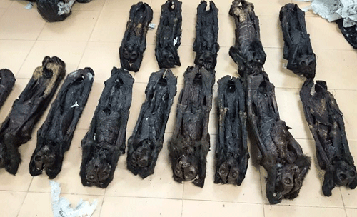 Qua kiểm đếm, xác định 2 bao tải chứa 20 xác động vật linh trưởng (chưa xác định được là khỉ, vọc hay vượn) đã được sấy khô và bọc kỹ bằng nhiều lớp nilon.