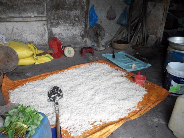 | Cơm dùng để ủ men nấu rượu sau khi nấu chín sẽ được đổ ra tấm bạt nhàu nhĩ, đen kịt ngay trên nền nhà nhếch nhác, bẩn thỉu để cho nguội và rắc men. |
