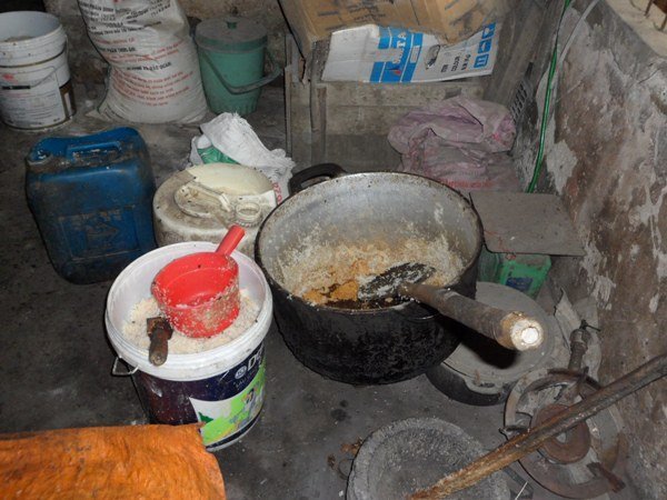 | Những thùng, chậu cơm rượu đã lên men chuẩn bị cho vào chưng cất rượu bẩn thỉu không khác gì nồi...cám lợn. |